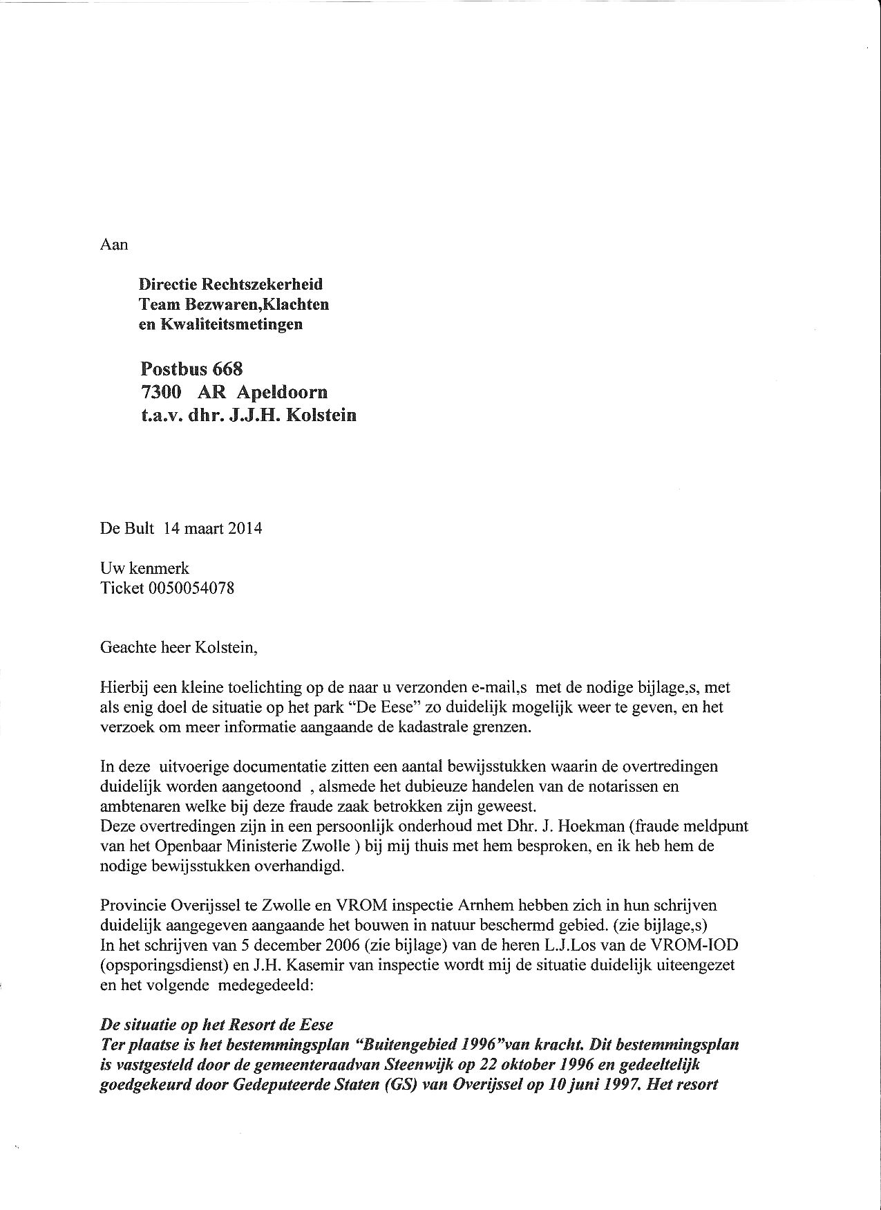 Brief aan het Openbaar Ministerie Oost-Nederland en mw. mr. N. Zandee bij Justitie over fraude op Park de Eese