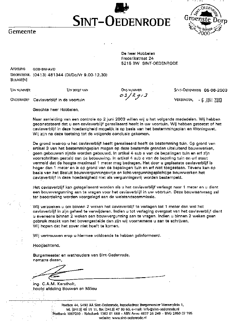 Hieronder ziet men het dreigement van de gemeente Sint-oedenrode om een bouwvergunning te eisen voor een caviahok in de tuin van de familie Hobbelen. In Sint-Oedenrode wordt op grove wijze met meerdere maten gemeten. Bij de familie Hobbelen moet een caviahok worden verlaagd tot een meter hoogte en daarnaast ook een bouwvergunning worden aangevraagd die eventueel geweigerd kan worden. Met dwangsommen en inzet van de Sterke Arm en slopersbedrijven op haar kosten zal bij weigering dit hok mogelijk met grof geweld worden verwijderd. Niemand heeft ooit bezwaar gemaakt tegen dit onderkomen voor kleine huisdieren om ze beschermen tegen o.a. katten. Daar tegenover gelden voor de buurman van ing. A.M.L. van Rooij evenwel andere normen, wetten, besluiten en democratische regels die meer lijken op een vorm van wraakneming en pesterij dan op integer bestuur. Dit, omdat de heer van Rooij fel gekant is tegen de lozings- en dumpingspraktijken van grote hoeveelheden kankerverwekkende stoffen in geïmpgregneerd hout dat zijn buurman de Gebr. Van Aarle produceert en daarmee gif diffuus verspreidt. Maar deze buurman kan en mag zonder dwangsommen, zonder bouwvergunning, zonder Wvo-vergunning en in strijd met Europse milieuwetten en regelementen onbelemmerd zijn gang gaan. Voor het neerzetten van meerdere bouwwerken tot wel veertig meter lengte en zes meter hoogte (en dat in het buitengebied waar sowieso geen inrichtinggen mogen worden neergezet) kijkt de inspectie met blinde ogen de andere kant uit. Je kunt rustig en hardop zeggen dat het bestuur van de gemeente Sint-Oedenrode in hoge mate belangenverstrengeld is en dat vriendjespolitiek en het gedogen van illegale praktijken schering en inslag is. De boven- en onderstaande voorbeelden laten aan de collusiepraktijken in Sint-Oedenrode geen enkele twijfel bestaan.