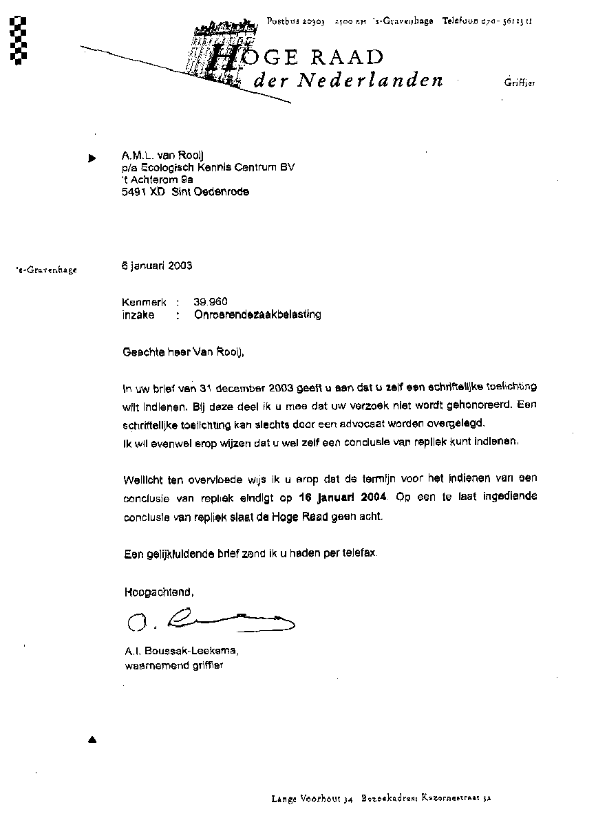 Nederland heeft zich als EU-lidstaat te houden aan de Europese wet- en regelgeving. Ik kan mij niet voorstellen dat zowel het Ecologisch Kennis Centrum B.V., alswel A.M.L. van Rooij persoonlijk, deze schriftelijke toelichting op het verweerschrift van 16 december 2003 in zijn eigen zaak niet mag overleggen aan de Hoge Raad der Nederlanden maar daarvoor een dure misdaadverstrengelde advocaat moet nemen. Bijgevoegd vindt u het uittreksel van de Kamer van Koophandel, dossiernummer: 16090111, van het Ecologisch Kennis Centrum B.V. (zie bijlage N). Daarin staat als bedrijfsomschrijving letterlijk het volgende: "Het verrichten van adviesdiensten op het gebied van milieu, arbeidsomstandigheden, ecologie en het voeren van juridische geschillen" Dit betekent dat het Ecologisch Kennis Centrum B.V. gerechtigd is tot het voeren van juridische geschillen. Wij verzoeken u dan ook hierover de volgende drie vragen te beantwoorden: