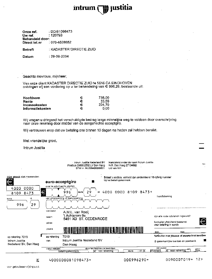 Reeds eerder heeft cliënt in deze aangelegenheid uw anonieme brief d.d. 29 september 2004, ref: DD/81098473, ontvangen (zie bijlage 2). Daarop hebben wij bij e-mail van 7 oktober 2004 naar uw medewerkster mevr. A. Hintzen gereageerd. Betreffende e-mail vindt u bijgevoegd (zie bijlage 3). Wij verzoeken u kennis te nemen van de inhoud en die inhoud hier als herhaald en ingelast te beschouwen. Met die inhoud is feitelijke komen vast te staan dat de opdracht tot uw anonieme vordering is gegeven door een anonieme persoon van het Kadaster Directie Zuid. Tot op heden heeft uw medewerkster mevr. A. Hintzen nog steeds niet gereageerd op onze e-mail van 7 oktober 2004. Ondanks dat krijgt cliënt van u een tweede anonieme invorderingsbrief d.d. 14 oktober 2004 toegestuurd met de dreiging dat binnenkort een deurwaarder zal langskomen om een dagvaarding aan te bieden waarop cliënt voor de rechter moet verschijnen. Dit alles op kosten van cliënt. Middels dit schrijven maken wij u zeer nadrukkelijk kenbaar dat, in tegenstelling met hetgeen door u wordt beweerd, er geen vordering bestaat. De door cliënt aan het Kadaster Directie Zuid verstrekte opdracht is door hen zelfs nog niet uitgevoerd. Mat nadruk verzoeken wij u de door u anonieme gestelde invordering, in opdracht van een anoniem persoon vanuit het Kadaster Directie Zuid, op grond van bovengenoemde feiten per onmiddellijk in te trekken, niet als geschreven te beschouwen en ondergetekende dat binnen 48 uur na heden schriftelijk te bevestigen. Mocht bovengenoemde verzochte schriftelijke bevestiging, binnen 48 uur na heden, uitblijven dan is er zeer nadrukkelijk sprake van strafbaar handelen vanuit Intrum Justitia Nederland B.V. in samenspanning met het Kadaster Directie Zuid. Dit alles onder volledige anonimiteit. Daarvan zal dan rechtstreeks aangifte worden gedaan bij de hoofdofficier van justitie bij het arrondissementsparket te 's-Hertogenbosch. In die aangifte zal ook een afschrift van deze brief worden overlegd. Deze brief aan u hebben wij laten plaatsen bij de Sociale Databank Nederland (SDN) op internet adres: www.sdnl.nl/ekc-kadaster3.htm Uw antwoord hierop, alle vervolg correspondentie daarop, als wel de eventuele aangifte tegen uw samenspannend handelen met het Kadaster Directie Zuid zal bij de SDN op internet worden gezet. In afwachting van uw antwoord, binnen 48 uur na heden, tekenen wij, Hoogachtend,