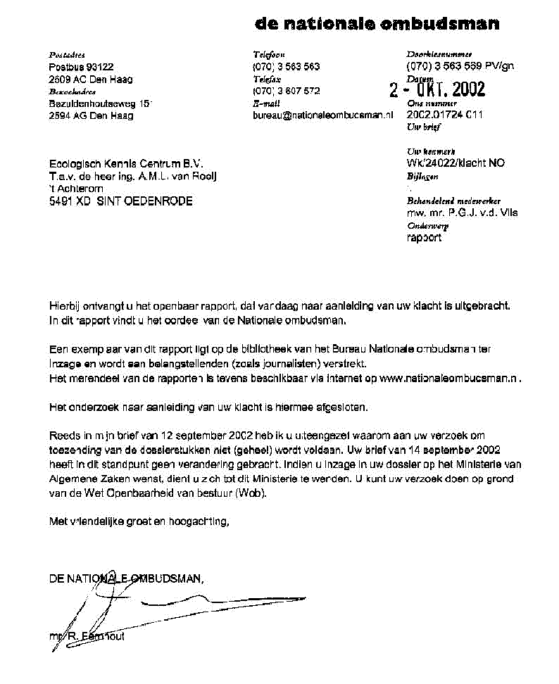 Wat schetst mijn verbazing: U doet net of u mijn bovengenoemde brief nooit hebt ontvangen en komt met uw openbaar rapport, rapportnummer: 2002/296 d.d. 26 september 2002 naar buiten, dat is gebaseerd op selectieve, subjectieve en onwerkelijke feiten. De echte feiten zoals u die o.a. kunt lezen bij de stichting Sociale Databank Nederland op internet, webpagina's www.sdnl.nl/nvvk.htm en www.sdnl.nl/epon-3.htm en www.sdnl.nl/ekc-mail.htm en www.sdnl.nl/ekc-persbericht.htm en www.sdnl.nl/houtmot.htm en www.sdnl.nl/ekc.htm met al haar doorkliks, worden door u verzwegen. Mijns inziens is dat de werkelijke reden waarom ik van u het dossier niet mag inzien waarop u uw "openbaar rapport" heeft gebaseerd. Het moge u duidelijk zijn, dat nu u uw rapport openbaar heeft gemaakt, het daaraan ten grondslag liggende dossier ook voor mij openbaar is. Juist om die reden richt ik aan u nogmaals het nadrukkelijke verzoek om mij binnen 8 dagen na heden een afschrift te laten toekomen van het volledige dossier waarop u uw "openbaar rapport" heeft gebaseerd. Tevens stel ik u hierbij volledig verantwoordelijk en aansprakelijk voor alle schade die u aanricht bij A.M.L. van Rooij en het Ecologisch Kennis Centrum B.V. met het op deze wijze afhandelen van mijn klacht en het openbaar maken van uw rapport 2002/296 d.d. 26 september 2002. Deze brief aan u is eveneens openbaar. Ik wil u daarom vragen om die bij uw openbaar rapport te voegen en als één geheel te verzenden naar de Nederlandse media en pers. Dit omdat zij recht hebben op eerlijke oprechte informatie. Ik verzoek u tevens mij dat schriftelijk te bevestigen. Het moge u duidelijk zijn dat ik op grond van bovengenoemde feiten erop sta dat u mij binnen 8 dagen na heden een afschrift laat toekomen van het volledige dossier waarop u uw "openbaar rapport" van 26 september 2002 heeft gebaseerd. Dit schrijven aan u heb ik laten publiceren bij de stichting Sociale Databank Nederland (SDN) op internet, webpagina: www.sdnl.nl/ekc-omb1.htm. Uw antwoord hierop, of het uitblijven van uw antwoord hierop, zal eveneens bij de SDN op internet worden geplaatst. In afwachting op toezending van het volledig dossier binnen 8 dagen na heden teken ik,