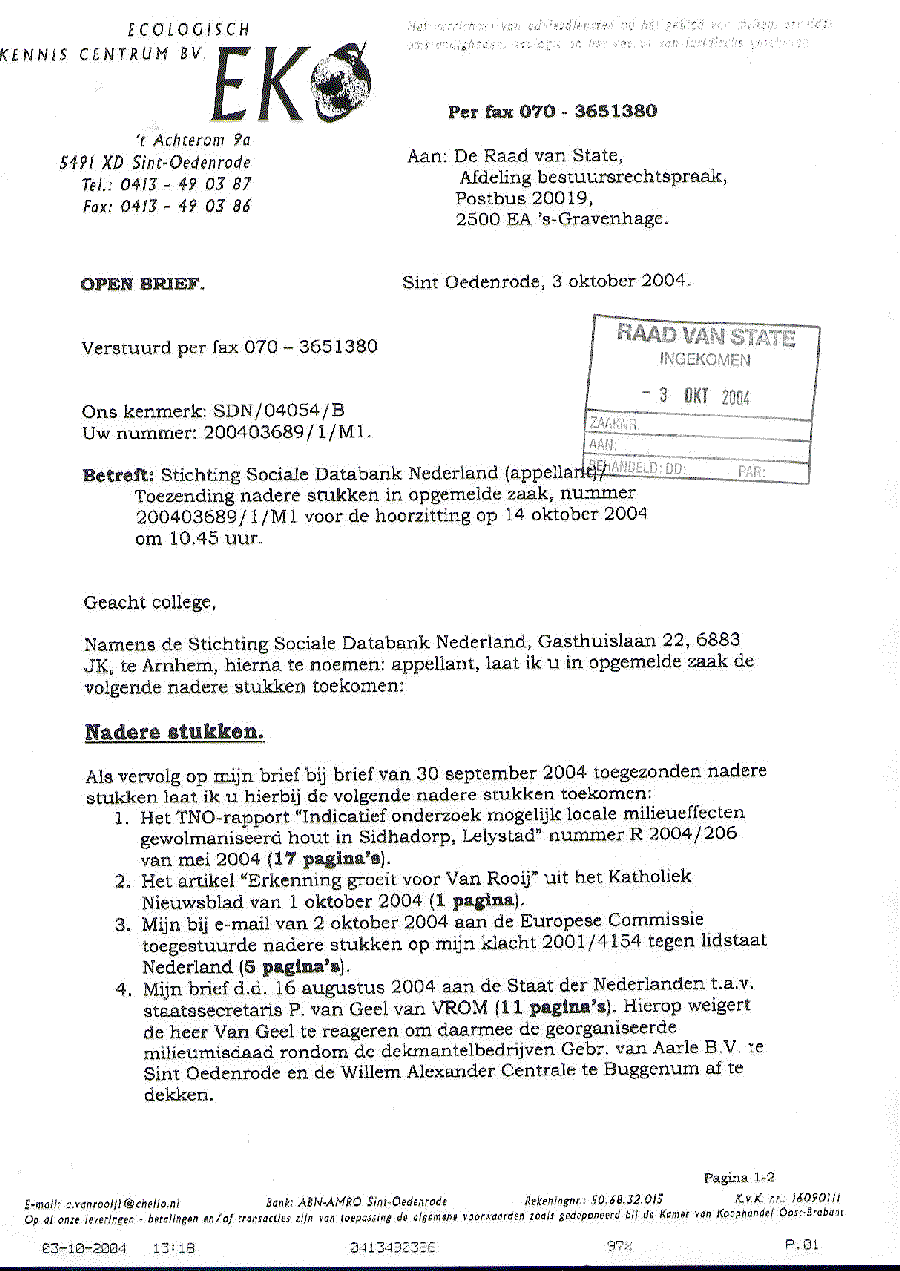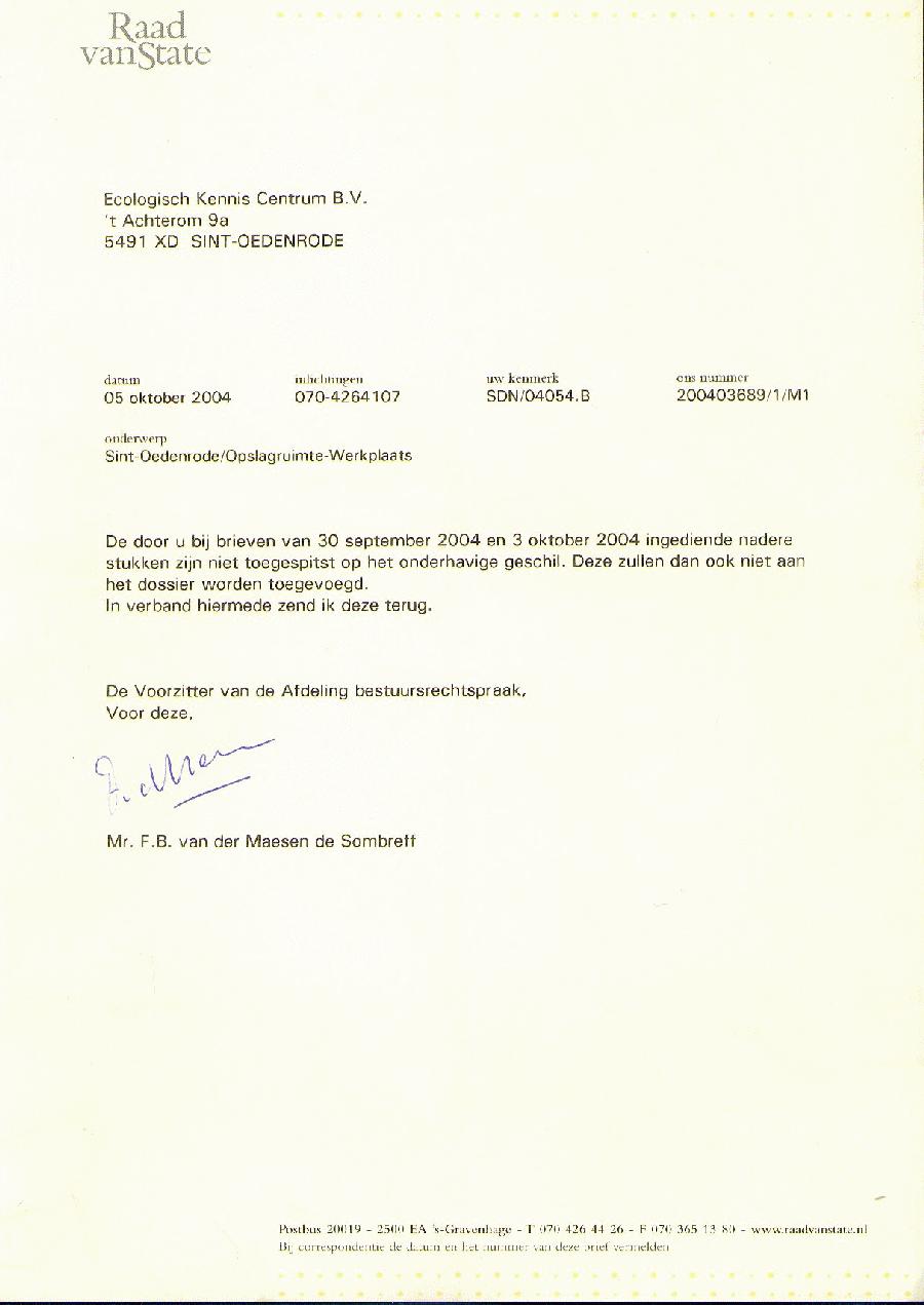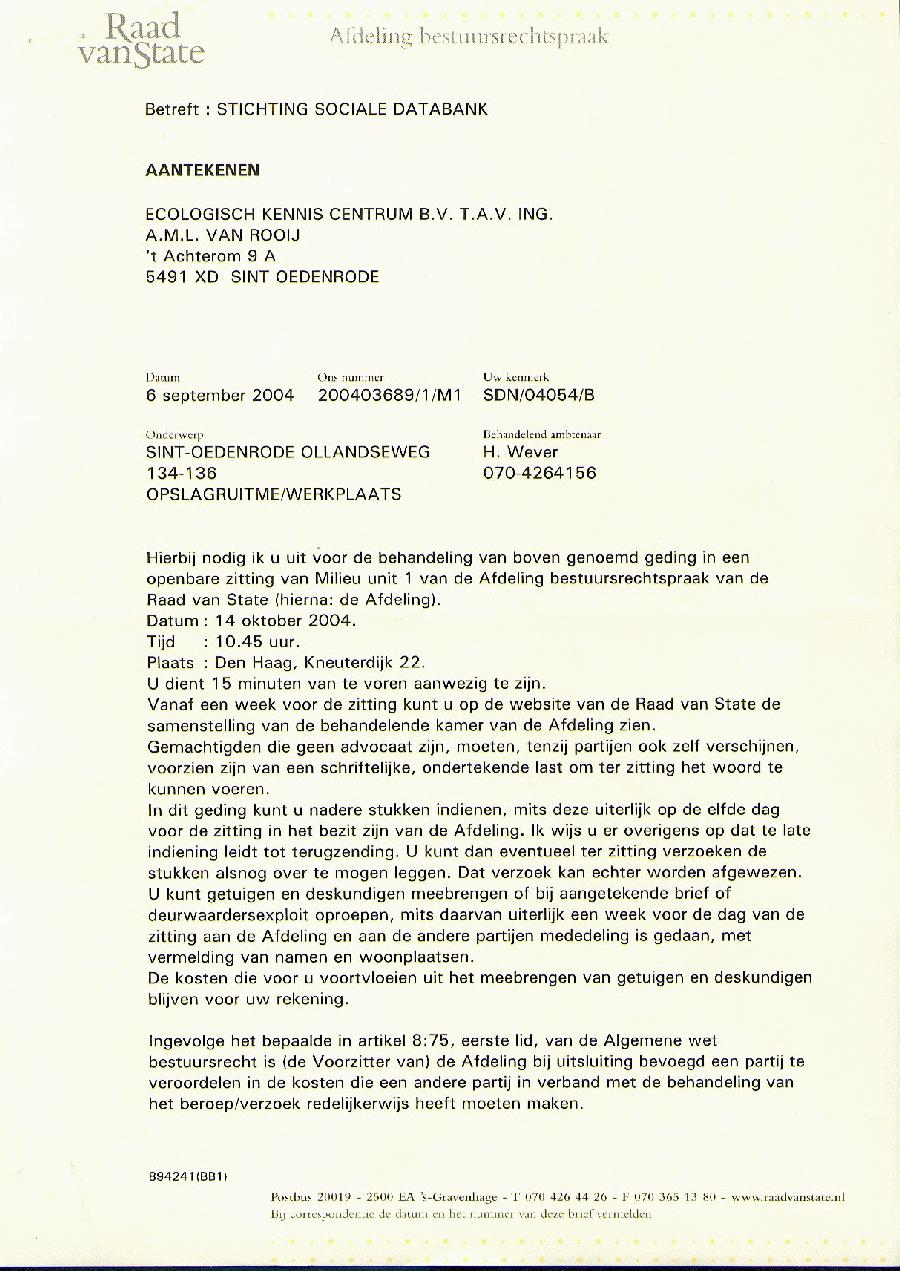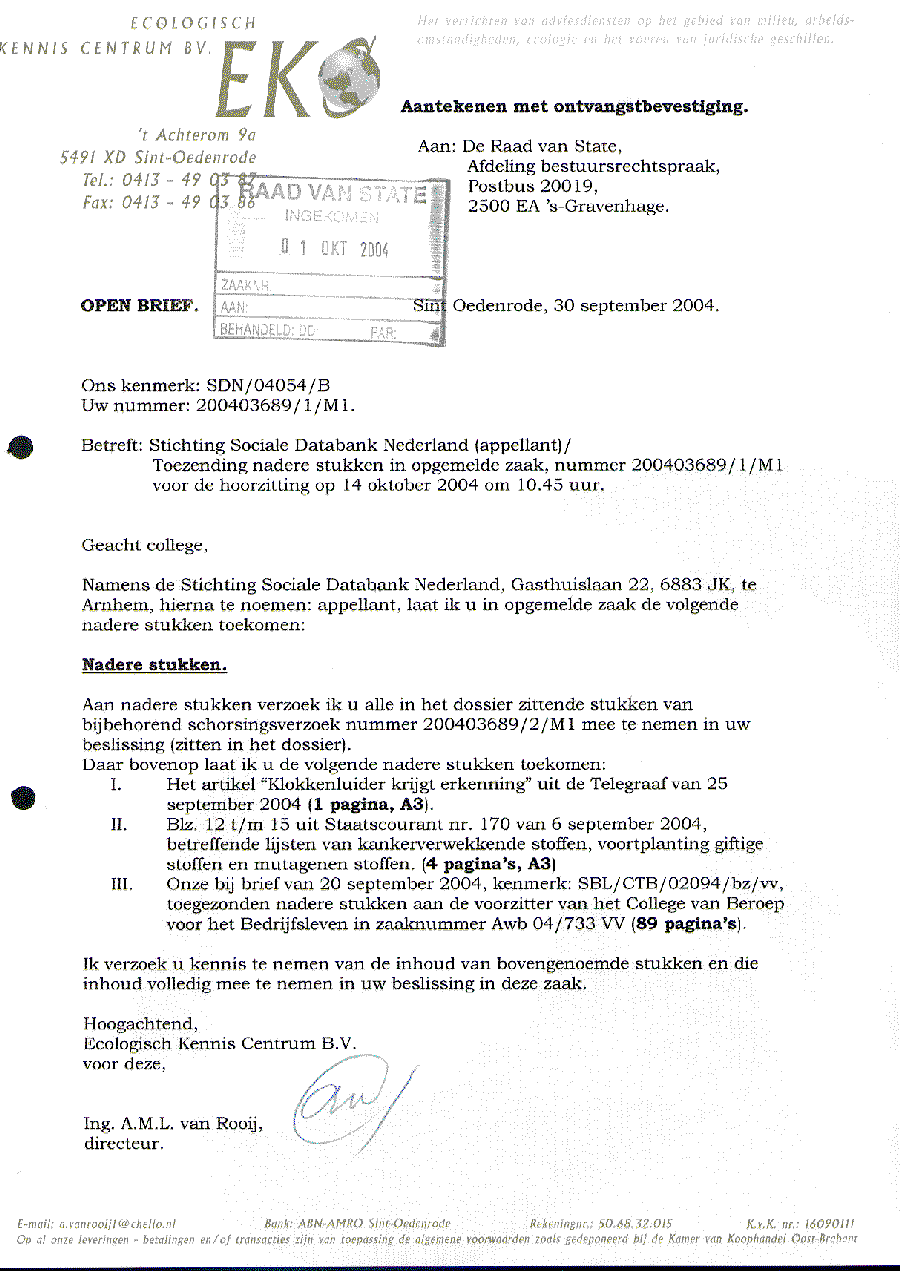 Per fax 070 - 3651380 Aan: Mr. F.B. van der Maesen de Sombreff (persoonlijk). Ambtenaar van Staat van de Raad van State Postbus 20019, 2500 EA 's-Gravenhage. Sint Oedenrode, 7 oktober 2004. Ons kenmerk: SDN/04054/B Uw nummer: 200403689/1/M1. Betreft: Stichting Sociale Databank Nederland (appellant)/ Eis tot het nemen van een besluit waarbij de behandeling van opgemelde zaak, ter zitting gepland op 14 oktober 2004 tot een nader te bepalen tijdstip wordt uitgesteld. Geachte heer van der Maesen de Sombreff, Namens de Stichting Sociale Databank Nederland, Gasthuislaan 22, 6883 JK te Arnhem, hierna te noemen: appellant, bericht ik u als volgt: Bij brieven van 30 september 2004 en 3 oktober 2004 heb ik u in opgemelde zaak nummer 200403689/1/M1 op de 13e en 11e dag vóór de zitting nadere stukken laten toekomen. Bij brief van 5 oktober 2004 stuurt u die stukken aan mij terug met de mededeling dat die niet toegespitst zijn op het onderhavige geschil en derhalve niet aan het dossier worden toegevoegd. Naar mijn mening betreft het hier wel degelijk voor dit geschil zeer essentiële informatie. Men kan hierover van mening verschillen, echter ik wijs u er op dat in de Algemene wet bestuursrecht nergens voorschriften opgenomen zijn ten aanzien van het op het geschil toegespitst dienen te zijn van nadere stukken, laat staan enige criteria waarmee dit toegespitst zijn door een behandelend ambtenaar, op voorhand in de plaats tredend van de bevoegde rechter, naar eigen inzicht nadere stukken uit een dossier kan verwijderen. Daarmee hebt u gehandeld in strijd met artikel 7:18, eerste lid, van de Algemene wet bestuursrecht. Ingevolge artikel 7:18, tweede lid, van de Algemene wet bestuursrecht is het beroepsorgaan wettelijk verplicht om het 'complete' dossier voorafgaand aan het horen gedurende tenminste een week voor belanghebbenden ter inzage te leggen. Met het terugsturen van de door mij bij brieven van 30 september 2004 en 3 oktober 2004 tijdig ingediende nadere stukken heeft u in strijd met artikel 7:18, tweede lid, van de Algemene wet bestuursrecht op onwettige wijze voor belanghebbenden een niet compleet dossier ter inzage gelegd en daarmee voor hen zeer essentiële informatie achtergehouden. Met klem verzoek ik u dit alles te corrigeren binnen 24 uur na heden en ondergetekende dat schriftelijk te bevestigen. Deze correctie zal moeten inhouden:
