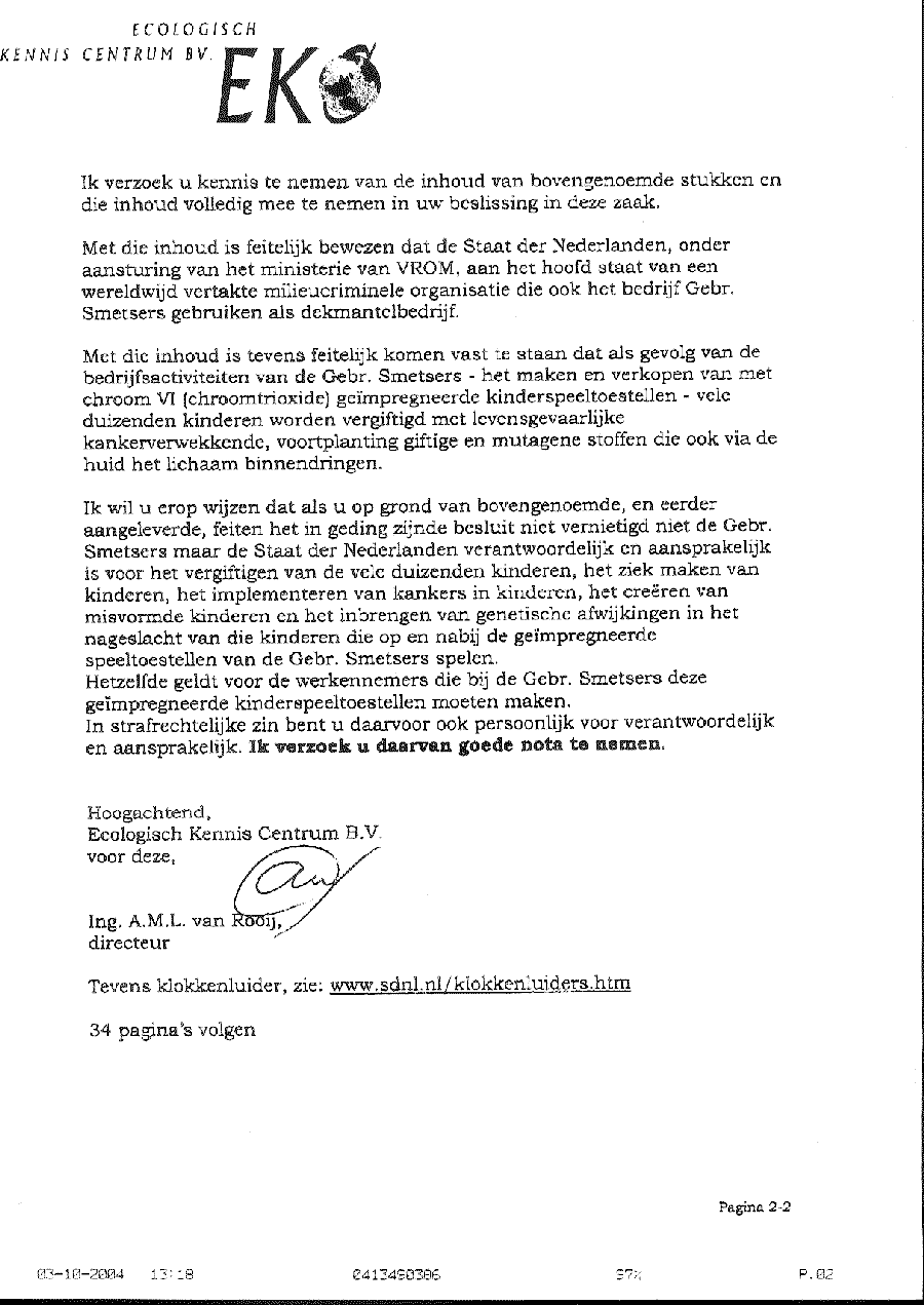 Om aan de hierboven wettelijke verplichting te voldoen kunt u de behandeling ter zitting op 14 oktober 2004 om 10.45 uur niet laten doorgaan. Ik verzoek u daarom hierop deze zitting tot een nader te bepalen tijdstip uit te stellen en ondergetekende dat binnen 24 uur na heden schriftelijk te bevestigen. Behoudens uw schriftelijke bevestiging binnen 24 uur na heden, waarin u mij kenbaar maakt dat het dossier alsnog compleet wordt gemaakt en de behandeling ter zitting tot een nader te bepalen tijdstip wordt uitgesteld, zal ik van deze hoogst ernstige, en strafbare gang van zaken rechtstreeks aangifte doen bij de hoofdofficier van justitie in 's-Gravenhage. Daarbij zal ook een afschrift van deze brief worden overlegd. Wij hebben dit schrijven en uw onderliggende brief van 5 oktober 2004, tezamen met onze brieven van 30 september 2004 en 3 oktober 2004 bij de Sociale Databank Nederland (SDN) op internet laten plaatsen op webpagina: www.sdnl.nl/ekc-rs138.htm Uw antwoord op dit schrijven, onze eventuele aangifte tegen dit door u gepleegde strafbare feit, onze volgende brieven hierover en de onherroepelijke uitspraak in deze zaak met als nummer 200403689/1 zullen eveneens bij de SDN op internet worden geplaatst. Hoogachtend,
