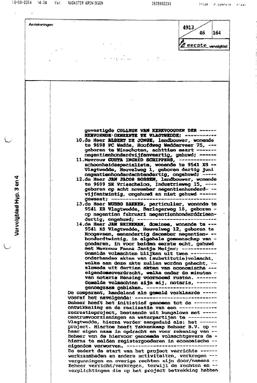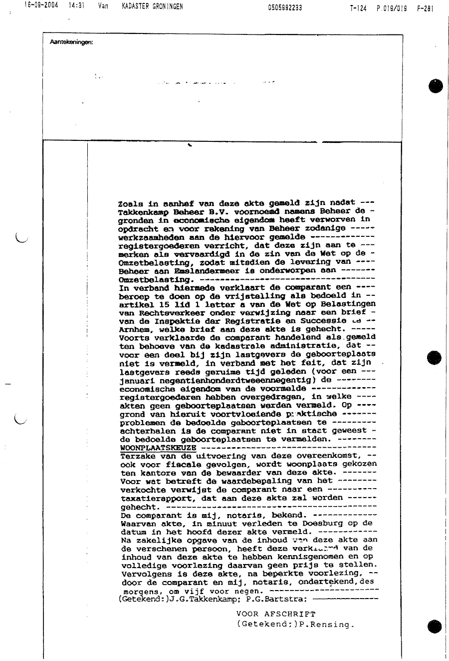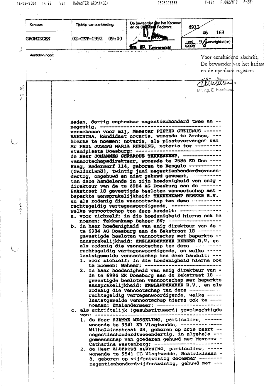 Notariële akte t.g.v. dhr. J.G. Takkenkamp als vennoot van Takkenkamp Beheer BV