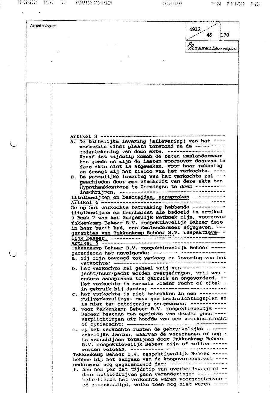 Eigendomsoverdracht van Emslandermeer BV (Takkenkamp) aan dhr. E.T. Breuer (01-05-96)