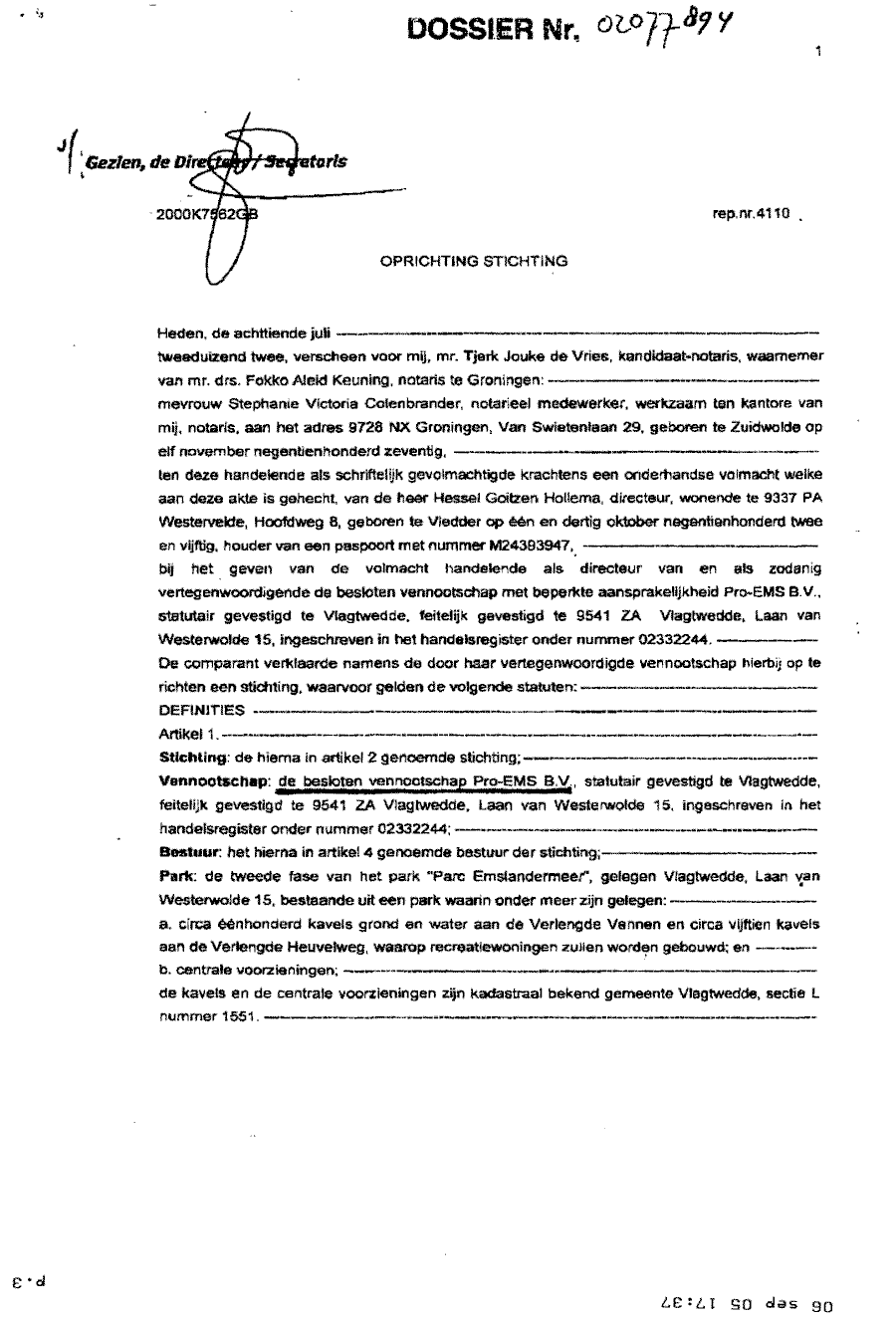 Koopcontract opgesteld door notaris Rensing t.b.v. Emslandermeer Beheer BV