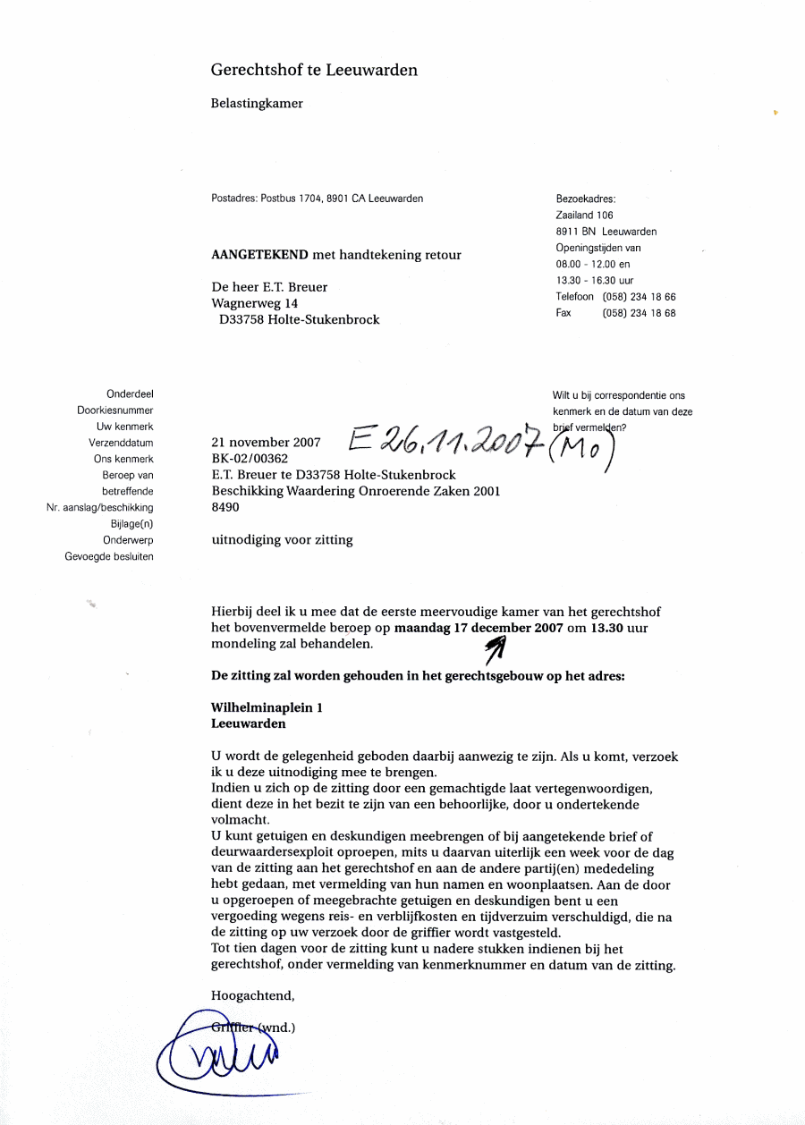 Uitnodiging Gerechthof Groningen voor een zitting bij de belastingkamer Leeuwarden