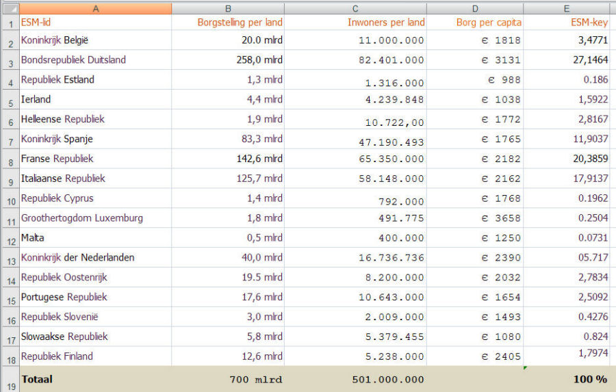 Sleutel en borgstelling per land en per capita volgens het ESM-verdrag