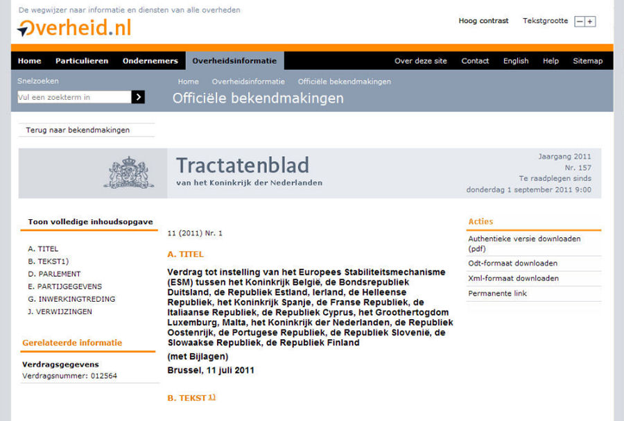 Volledige tekst van het tractatenblad van de overheid inzake het ESM-verdrag (Klik)