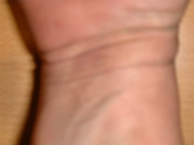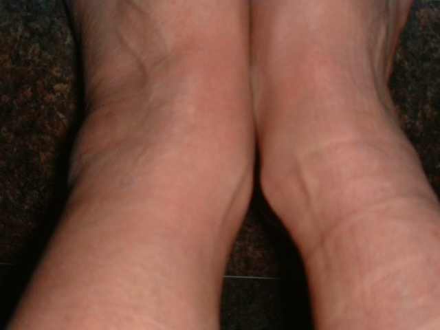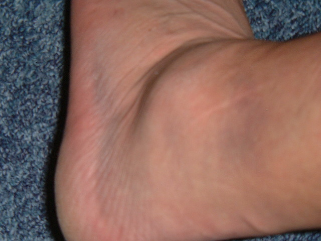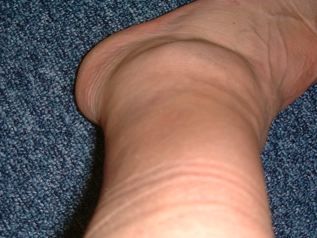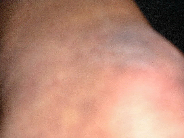 Gezwollen enkel links en striemen op het rechter onderbeen