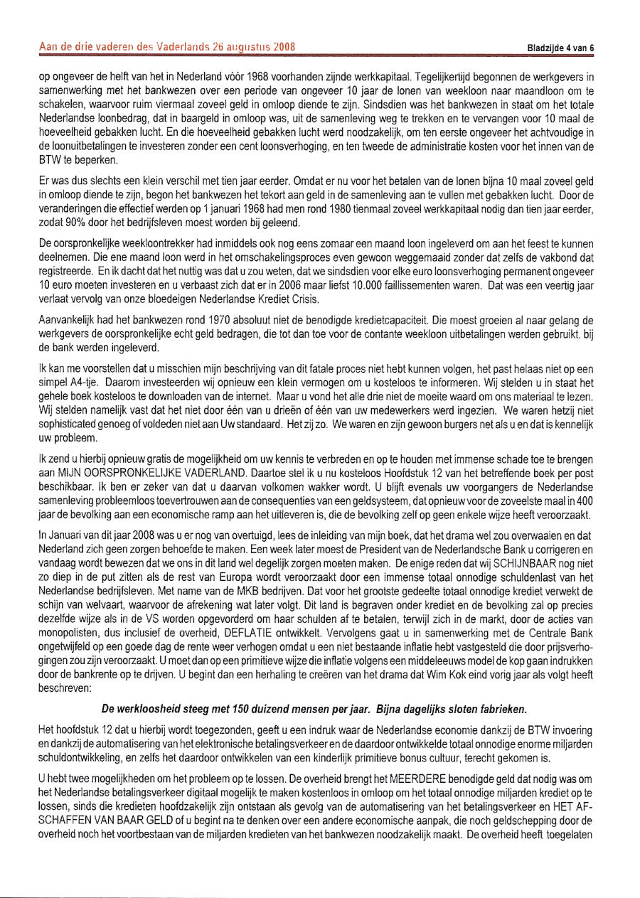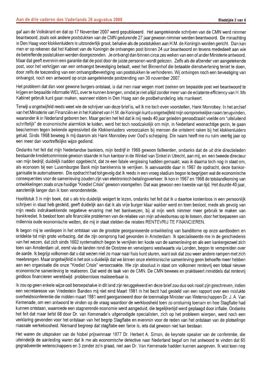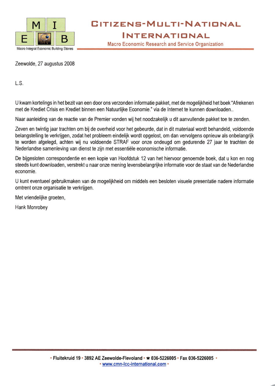Verplichte lectuur van journalisten, alle politici, alle economen en alle bankiers Nu, 27 jaar later worden economen en bankiers dankzij de kredietcrisis in de Verenigde Staten zich bewust dat er iets niet klopt met het geldstelsel waarop ons economisch functioneren berust. Op EuroStaete wordt een reële oplossing geboden. Klik op de foto: Lezing I (23 min.), daarna Deel II (66 min.) Hank Monrobey schreef in 1981 zijn boek over de aspecten en functies van het geld, inflatie, deflatie, omloopsnelheid, rente. Maar ook over herstelmogelijkheden van de economie wanneer het bedrijfsleven 'n eigen verrekencircuit zou opbouwen naar Zwitsers model. Hieronder het voorblad van Vaarwel Geld / Goodbye Money. Op 27 augustus 2008 schreef hij onderstaande brief aan premier Balkenende en de vicepremiers W. Bos en A. Rouwvoet met een kopie naar de fractie van de SP in de Tweede Kamer. Nu zien wat er gebeurt !!