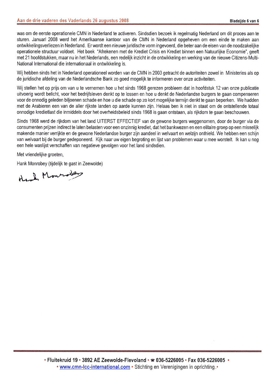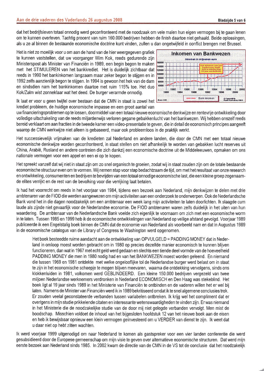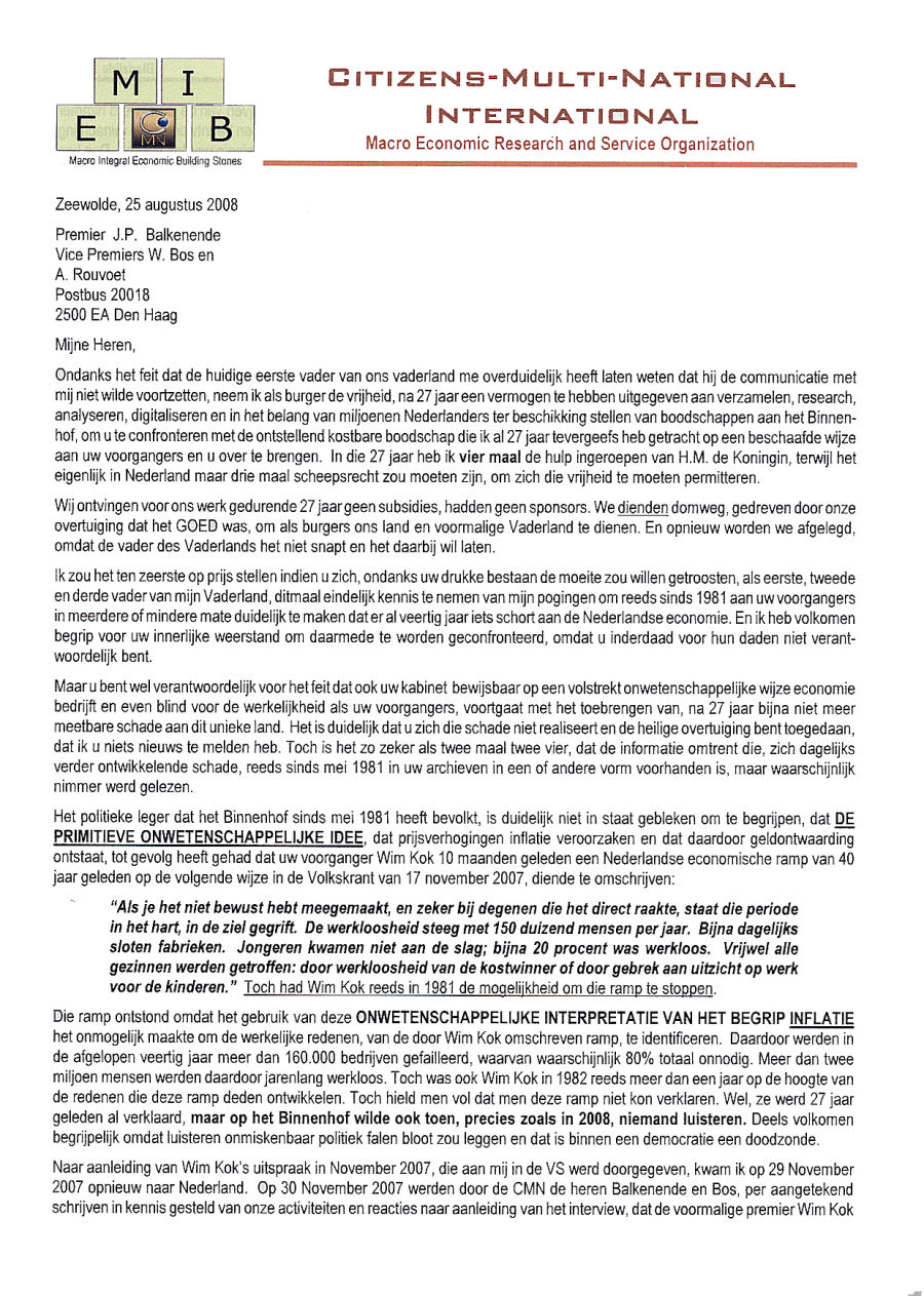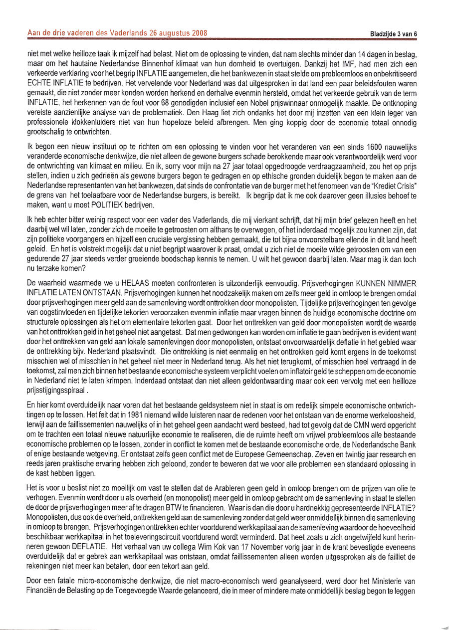 Verplichte lectuur van journalisten, alle politici, alle economen en alle bankiers Nu, 27 jaar later worden economen en bankiers dankzij de kredietcrisis in de Verenigde Staten zich bewust dat er iets niet klopt met het geldstelsel waarop ons economisch functioneren berust. Op EuroStaete wordt een reële oplossing geboden. Klik op de foto: Lezing I (23 min.), daarna Deel II (66 min.) Hank Monrobey schreef in 1981 zijn boek over de aspecten en functies van het geld, inflatie, deflatie, omloopsnelheid, rente. Maar ook over herstelmogelijkheden van de economie wanneer het bedrijfsleven 'n eigen verrekencircuit zou opbouwen naar Zwitsers model. Hieronder het voorblad van Vaarwel Geld / Goodbye Money. Op 27 augustus 2008 schreef hij onderstaande brief aan premier Balkenende en de vicepremiers W. Bos en A. Rouwvoet met een kopie naar de fractie van de SP in de Tweede Kamer. Nu zien wat er gebeurt !!
