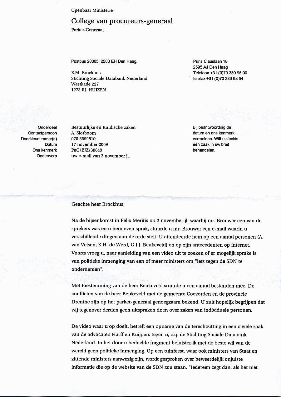 Reactie op de brief van het College van procureurs-generaal over mijn opmerkingen in de zaal Aan de redactie van Buitenhof L.s., Ik moet nog een reactie schrijven op het antwoord van de heer A. Slotboom namens Procureur-generaal Harm Brouwer. De heer Brouwer vroeg mij hoe het de heer Ad van Velsen vergaat na zijn bezoek aan hem vorig jaar. Bij navraag bij van Velsen blijkt dat hij heden nog steeds geen compensatie heeft ontvangen voor de schade die politie en Justitie hem hebben aangedaan. Justitie schijnt jaren tijd te hebben alvorens schades uit te betalen, terwijl het innen van boetes en beslagleggingen razend snel gaan. Het imago van de rechtsstaat komt hiermee wel op losse schroeven, zoals ook die van de overheid als geheel, zoals bij de Catshuisbrand werd aangetoond met: “Wij zijn wel verantwoordelijk maar niet aansprakelijk” (om schade te vergoeden). Zie voor het dramatische relaas van de heer A. van Velsen op www.sdnl.nl/pleidooi.htm Een ander geval van een dertigjarig gevecht tegen het OM is dat van dhr. K.H. de Werd die weliswaar een schadecompensatie kon krijgen voor een bepaalde zaak van ca. 300.000 euro, maar dat niet krijgt, omdat Het OM zegt dat dan de heer de Werd voldoende procedurebrandstof heeft om zijn echte claim van vele miljoenen te kunnen starten tegen het OM dat juridisch met de rug tegen de muur staat. Zelfs de advocaat van deze man werd de wacht aangezegd met hem te verbieden zijn cliënt bij te staan in rechte. Zie: www.sdnl.nl/de-werd.htm Weer een geval van o.i. machtsmisbruik door het OM is de affaire van Anthony van Belle, die slachtoffer lijkt te zijn van overijverige ambtenaren van VROM en het OM en ten onrechte beslag is gelegd op zijn bedrijfskapitaal, zogenaamd onder de regeling van de plukze-wet. Alles verzet zich tegen een eerlijk proces.