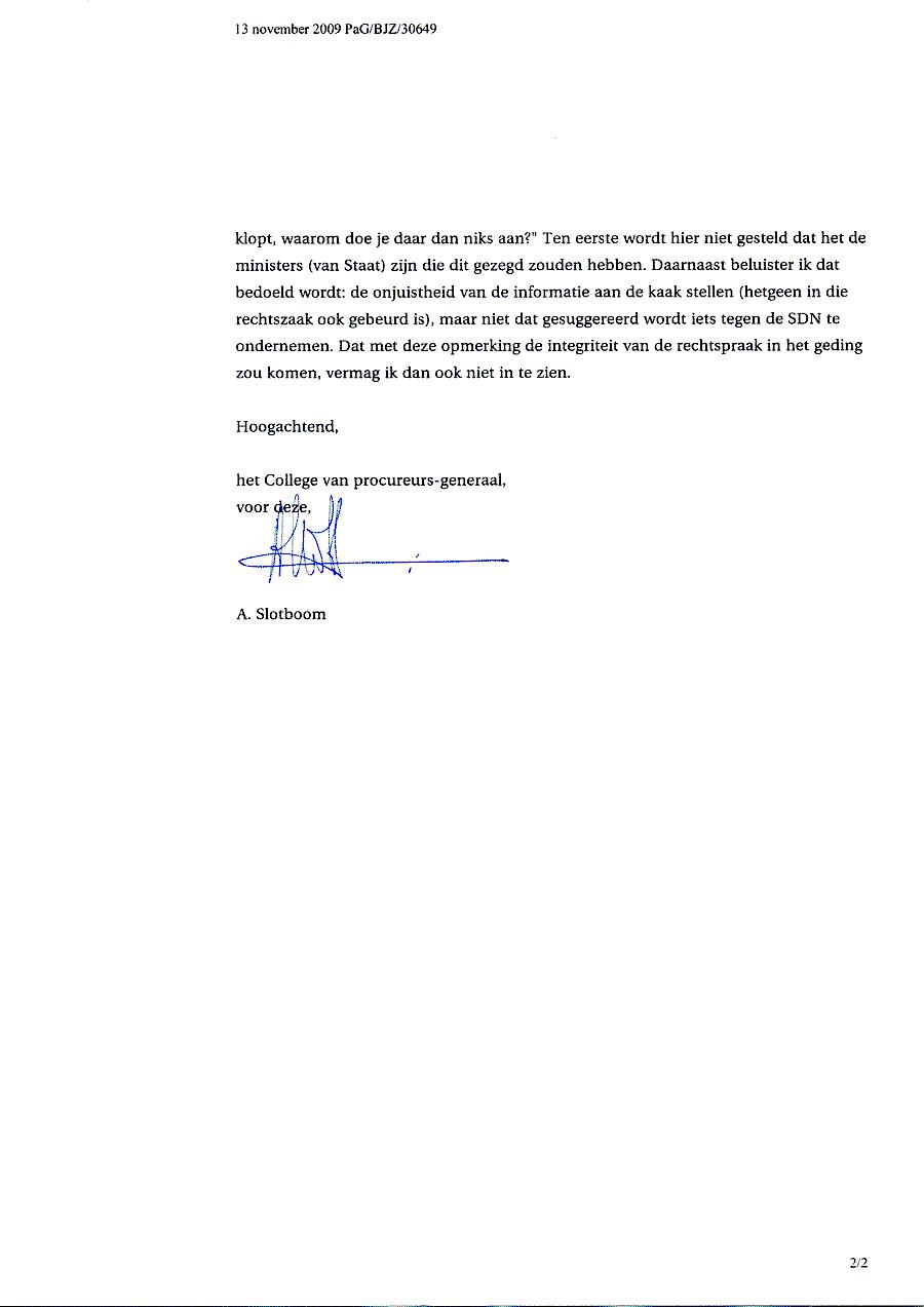 Geachte heer Slotboom, Uw conclusie is volstrekt onjuist. Een aantijging over mr. Harff is nooit gedaan. Hij is door de SDN of de interviewer nergens van beschuldigd. Hij kwam noch als persoon noch in zijn functie als advocaaat in het interview met de Heer Kucharek aan de orde. Alleen werd vermeld dat hij de procureur was van mr. H.F.C. Kuijpers. Het geeft geen pas om daarmee zich als mede-eiser te presenteren met een schadeeis en een dwangsom voor hem alleen van 25.000 euro. Dat u niet wilt dat het lasteren en liegen van advocaten in de rechtszaal niet strafbaar wordt, diskwalificeert u als integere ambtenaar bij het College van Procureurs-generaal. Inmiddel weet ik waarom dat zo gebruikelijk is. De voorzitter van de Raad voor de Rechtspraak mr. Bert van Delden heeft met klem de rechtbanken en gerechthoven aangeraden nooit jurisprdentie te laten ontstaan waarbij het voor advocaten starfbaar wordt wanneer zij de rechter staan te beliegen en de tegenpartij de lasteren en smaden. Dit verhaal krijgt tezijnertijd zeker een staartje.