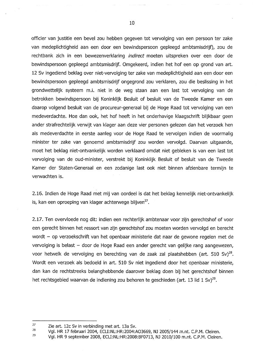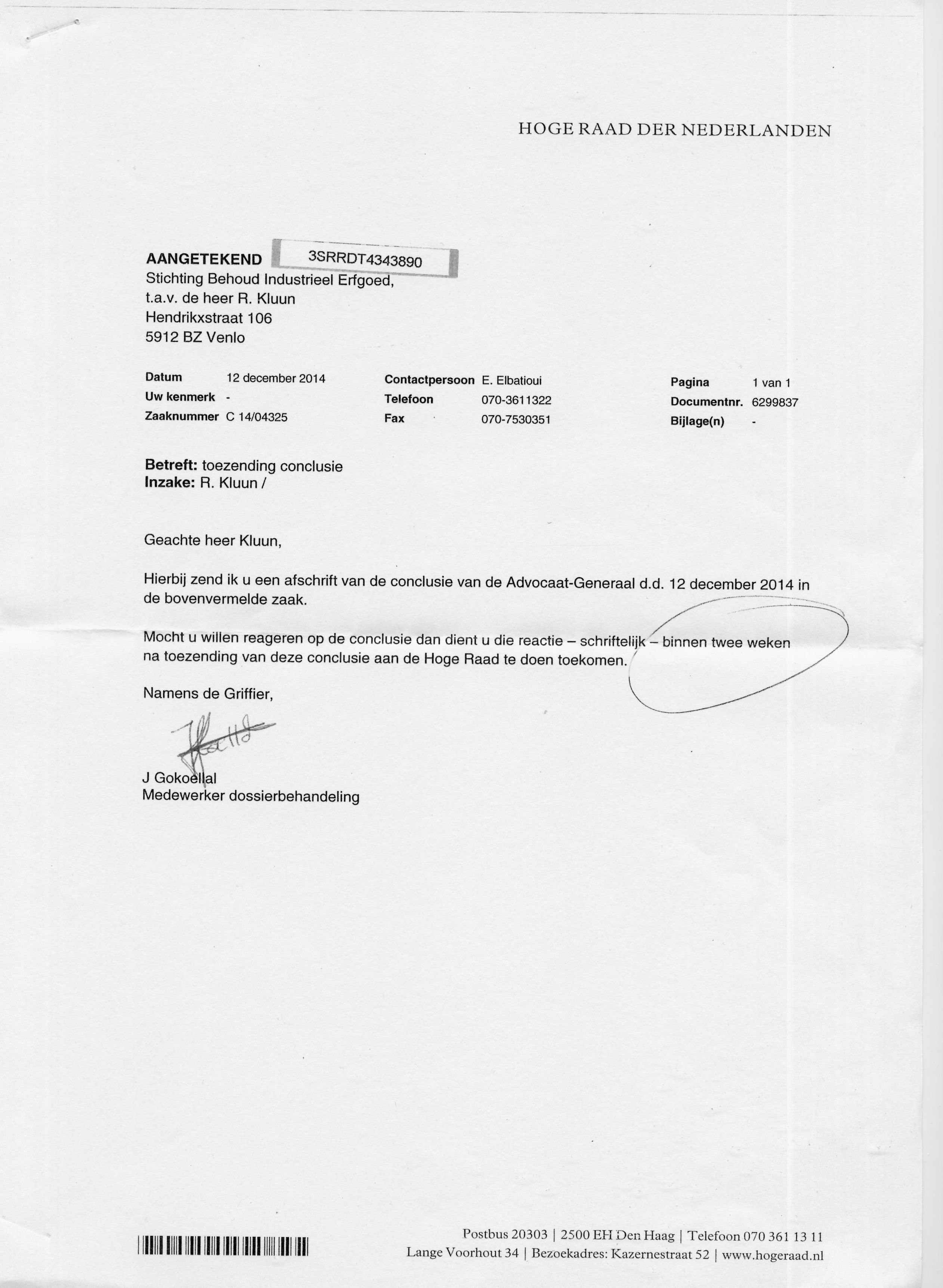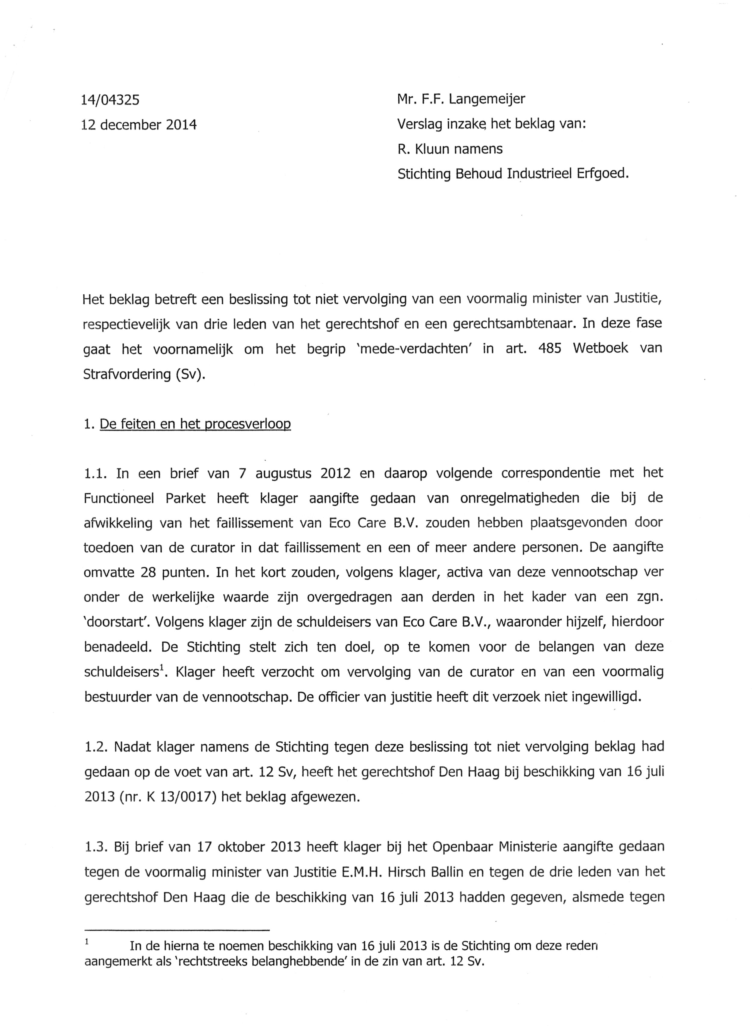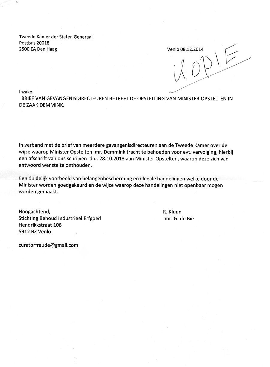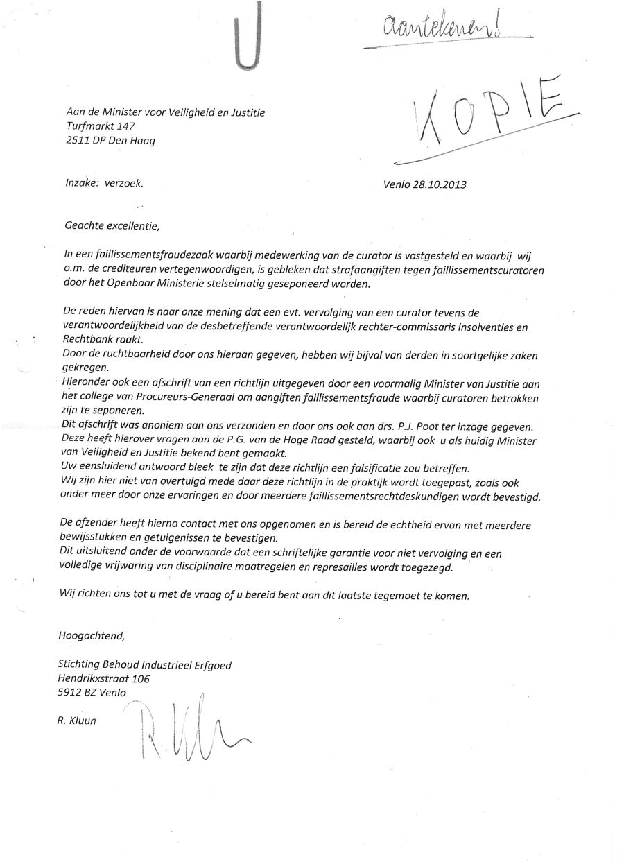 Het niet-vervolgen door het OM van fraude van een curator, als beleids- en richtlijn van minister Hirsch Ballin van Justitie. Deze van de Stichting Behoud Industrieel Erfgoed ontvangen kopie zal ook worden gepubliceerd op de website van de heer R. Kluun als representant van die stichting. |