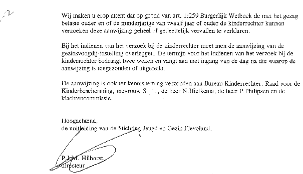 De heer N. Hielkema, teamleider, wil graag een gesprek met u , en ex-vrouw en de heer Philipsen over de gang van zaken. Hij nodigt u bij deze ook allen uit voor een gesprek op vrijdag 12 februari a.s. om 14.00 uur. Het gesprek zal gehouden worden ten kantore van Stichting Jeugd en Gezin Flevoland, gevestigd aan De Stelling 13-01 te Lelystad.