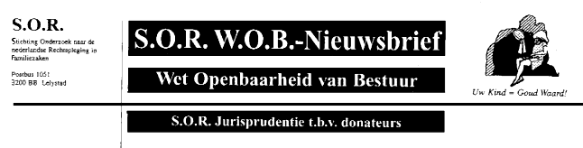 Laat de S.O.R. op grond van de verworven jurisprudentie voor u een W.O.B.-verzoek indienen! De S.O.R. doet onderzoek naar de Nederlandse rechtspleging in familie- en jeugdzaken en wenst inspraak in de bestuurlijke beleidsvorming binnen de Justitiële Kinderbescherming. de Vrijwillige Jeugdhulpverlening, alsmede de uitvoering van de Algemene Bijstandswet (Partij en Politiek onafhankelijk). Ingeschreven in het Stichtingenregister te Amersfoort onder nummer S-188953.