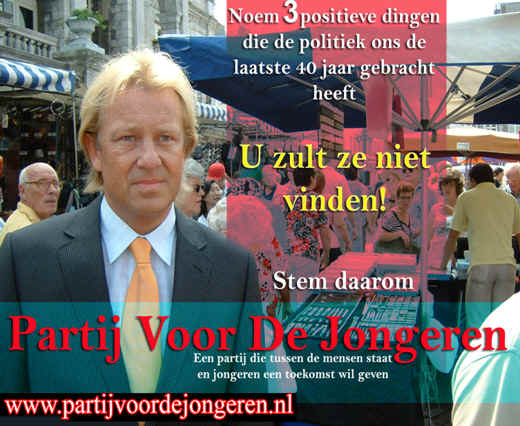 Beste mensen, stel u zelf eens de volgende vraag: Als u deze vraag niet kunt beantwoorden is het tijd om op 22 november a.s. te kiezen voor een partij die wel tussen de mensen staat en onze jongeren een toekomst wil geven. Dus stem Partij Voor De Jongeren want de problemen waarmee onze maatschappij kampt kunnen niet worden opgelost door de politieke orde die al 40 jaar met angst over Nederland regeert.