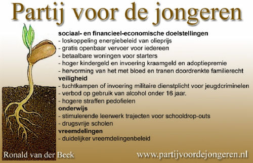 Ik wil mij graag aan u voorstellen. Ik ben Ronald van der Beek, ik sta nummer 8 op de ``Lijst zonder Naam (lijst 14)`` en stel mij kandidaat voor de 2e Kamerverkiezingen op 22 november 2006. Wilt u meer te weten komen over mijn partijprogramma of over mij kijk dan eens op mijn website http://partijvoordejongeren.nl