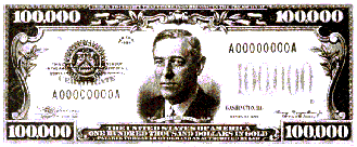 Federal Reserve Note, 1934, met de tekst : "This is to certify that there is on deposit in the treasury of the United States of America, one hundred thou-sand dollars in gold, payable to bearer on demand as authorized by law" |