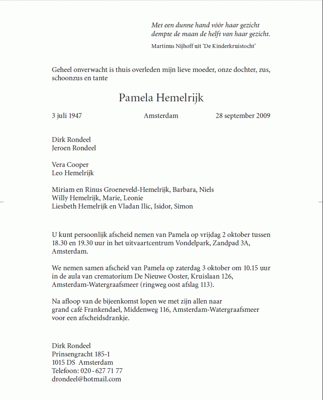 Fotoreportage van het afscheid van Pamela Hemelrijk in de aula van het crematorium