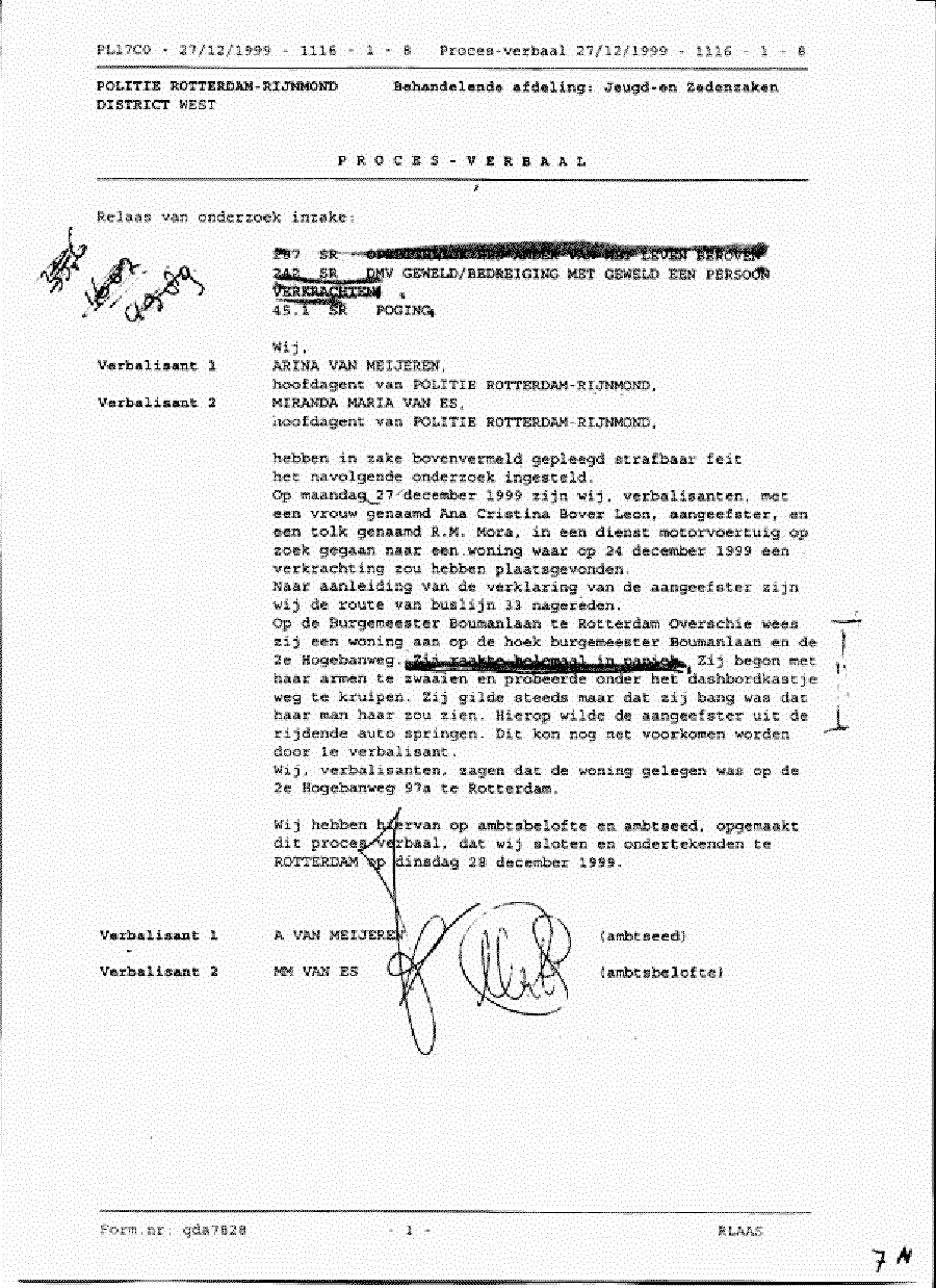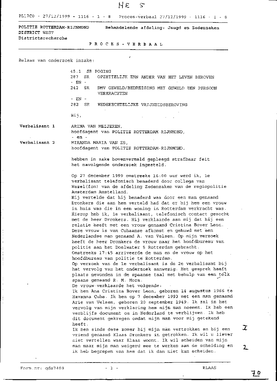 COMMENTAAR OP 1E DEEL VAN VERKLARING CRISTINA, BLZ. 65-66 1e Cristina woont niet samen met deze vriend, maar bij haar vriendin Bianca en een andere vriendin in huis. Zij heeft van september tot december in een restaurant in Utrecht gewerkt met een salaris van fl. 1100,- per maand. Met dit salaris is het onmogelijk iedere dag de bus en trein van woonplaats Amsterdam naar werkplek Utrecht te betalen. Apart hiervan is het ook uiterst moeilijk om in verband met de werk- en reistijden, ook de voor haar broodnodige rust in acht te nemen. Reistijd en kosten en onderhoudskosten voor twee kinderen in Cuba plus vliegtickets verhinderen haar om een normaal bestaan te leven. Verder geeft zij in deel drie 'nader verhoor' aan dat zij zonder beroep is. 2e Zij zegt dat ik niet meewerk aan de scheiding, maar mijn aanwezigheid is niet nodig om te scheiden. Als zij dat wenst, kan zij dat zelf regelen. In oktober heeft zij de scheiding aangevraagd, maar niet ondertekend bij haar advocaat in Amsterdam, omdat zij weer met mij samen wilde wonen. 3e Zij zegt; 'mijn man belt mij op mijn mobiele telefoon' en zegt een woning te hebben gehuurd in Rotterdam; dat is een leugen. Wij hadden namelijk al in november afgesproken om weer samen te wonen en ook zouden wij dan voor Cristina een psycholoog zoeken. (zie vertaler van cassettes) Ook heeft zij om deze reden de papieren van de scheiding niet ondertekend. Nooit heb ik over een paspoort of scheiding gesproken, daarvoor moet zij bij de overheid of advocaat zijn, niet bij mij. 4e In dit deel verklaart niet Cristina, maar Bianca, die tijdens dit verhoor aanwezig was en in feite de beschuldiging heeft neergelegd. Door de afhankelijkheid van Cristina en haar vorm van vriendschap jegens Bianca, kon zij haar eigen wil niet de vrije loop laten en is de loop van het verhoor zwaar beinvloed door haar minne vrienden. 5e Bianca heeft Cristina naar het station gebracht, niet Klaas. 6e Hier heeft Cristina een uur op mij gewacht in verband met een misverstand. Toen zijn wij samen met de trein naar Rotterdam gegaan vanuit Utrecht. 7e Zoals hierboven vermeld, heb ik Cristina op het station in Utrecht opgehaald, niet in Rotterdam. 8e Hier verklaart Bianca, haar man heeft haar opgesloten. Zie deel drie, punt 8; 'ik kon weg want de deur zat niet op slot'. 9e Cristina zegt dat ik een paspoort voor haar zou regelen. Dat is een leugen. Dat is een exclusieve taak van de overheid. Zij zegt 'vrijdag, 24 december', later weet ze dat niet meer en verwisselt ook de dag voor de nacht. 10e/11e Hier zegt zij dat ik geweld heb gebruikt en zij zegt zich te hebben verdedigd, wat ook een leugen is; geen enkel kledingstuk is kapot en ook het laken is heel. zij is niet gewond. Zie deel drie, punt 24. 12e Hier zegt zij dat ik, na haar te hebben verkracht, ben weggegaan. zie 25 A, derde deel (zie ook latere verklaring, waarin zij zegt dat ik daarna een dag en een nacht heb geslapen) 13e Zij zegt dat zij op kerstdag heeft kunnen ontsnappen en naar Amsterdam is gevlucht. (zie deel twee, punt 28; 'Arie heeft mij naar het station gebracht' en zegt tevens dat zij naar Utrecht is gegaan naar een vriendin. 13a Waarom heeft zij de pillen meegenomen, zoals zij beweerd. Waren die voor mij bestemd? 14e Cristina neemt deze pillen in (zie deel drie, punt 20 en 21). Zij zegt immers dat deze pillen voor mij waren (zie tevens verklaring Teresa). 14a Ze zegt hier nog meer tabletten te hebben. Ik hoop dat het de officier van Justitie nu wel duidelijk is dat zij de gebruiker is en niet ik. 15e Ik vraag mij af, hoe zij dit aan Klaas heeft kunnen uitleggen, hij spreekt geen woord spaans of engels en door zijn oppervlakkige leven heeft hij ook niet het vermogen om te analiseren wat zij wel bedoeld. 16e Zij is bang voor de politie. Daarom is ze een schijnrelatie met Klaas aangegaan om haar verblijfsvergunning te behouden. 17e Zij wil een aangifte tegen mij doen, maar in deel drie, punt 2 en 3, zegt zij dit niet gewild te hebben, maar dat haar vrienden haar hiertoe hebben aangezet (overgehaald) en haar hebben gezegd dat ik haar heb aangerand. Zij zegt dat ze erg bang van mij is. Waarom is dat nu, dat is nooit zo geweest. Ik heb heel goed voor haar en de kinderen gezorgd (zie verklaring van 'gedelegeerde van de stadsraad' Lois-alonzo, van officier van Justitie, anniledy Travieso-Robaina, gedelegeerde Dolores mendez Vega van het comite ter verdediging van de revolutie en oud strijder en vriend van President Fidel Castro en Maria Teresa Tejeda Izquierdo, buurvrouw en speciale vriendin van zowel mijn vrouw als mijzelf. Felina O Hernandez-Gonzalez, vertrouweling en hoofd van de huishoudelijke verzorging van onze familie, op landgoed 'Fincha Pierhahita' en vele ander verklaringen. 18e Cristina zegt dat ik verschillende malen heb vastgezeten. Iedereen weet waarvoor en daarvoor helpt de politie mij (voor zover zij niet in conflict met hun functie komen). Zij bestraffen mij niet omdat zij mij moreel gelijk geven in mijn strijd tegen de overheid in nederland. Juist door deze onrechtvaardigheid voel ik mij in Cuba erg thuis. 19e Zij zegt hier dat zij mij de gevangenis in wil hebben. De motivatie hiervan is, dat zij wil dat haar moeder en vader het landgoed helemaal in handen krijgen. Ik heb dit gekocht en betaald met alles wat er op en in is. Hiervoor heb ik tien jaar hard gewerkt en nu hebben zij dit uitgevonden om mij in de gevangenis te krijgen. 20e Ik zou graag willen weten wat ik hen misdaan heb. Tot op dit moment doe ik alles wat er van een goed huisvader verwacht en verlangt kan worden met de meeste verantwoording voor die taak. N.b. deze twee pagina's zijn mijn reactie op de eerste twee pagina's van de aangifte van Cristina Bover Leon. De complete aangifte bestaat uit negen pagina's.