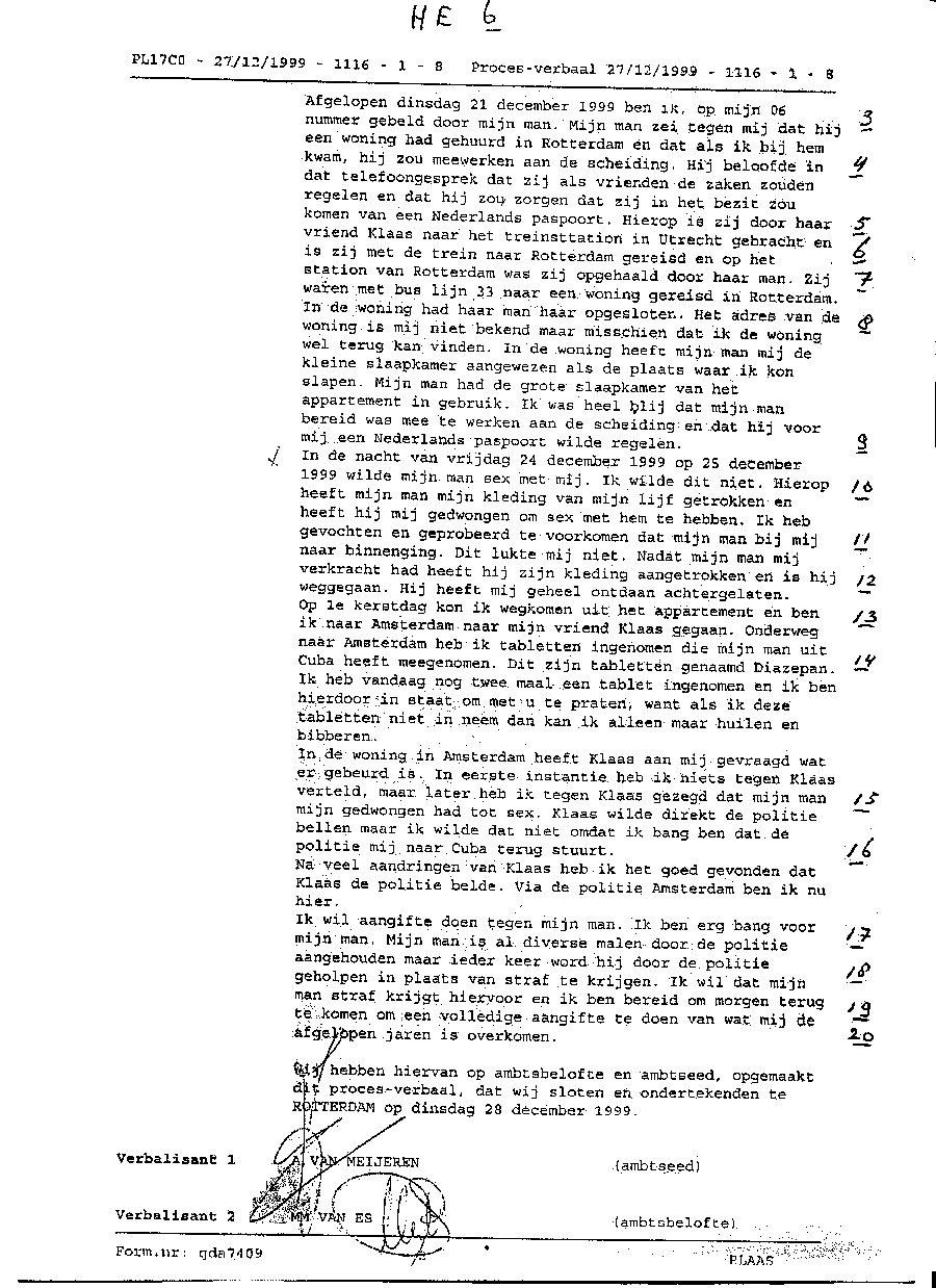 2e Zij zegt op het laatst met haar vrienden over de zogenaamde verkrachting te hebben gesproken, maar dat is direct of al in de week voorafgaande aan onze hereniging afgesproken (zie ook hieronder opmerkingnummers 17, 14, 8, 18, 9 en 27 en in verklaring vervolg blz. 68, boek, punt 17. Verder in verklaring van Bianca, blz. 77 van boek punt 12, 13, 18, 19 2n 20. Ook die verklaring van Klaas meldt dit, blz. 81, punt 36.) 3e Zij (Klaas en Bianca) zeiden haar dat ik haar had aangerand en dat zij naar de politie moest gaan. Haar opinie was niet zo belangrijk. Haar enige commentaar was dat ze dacht dat dat niet goed was. 3a Buitengewoon vreemd als je, als betrokkene, eerst zegt dat het niet goed is en vervolgens toch naar de politie stapt, omdat anderen dat zeggen. 4e Ik heb nooit gezegd dat zij een relatie had in augustus. Dat zegt zijzelf in het belang van haar verblijfsvergunning en in september waren wij nog samen in Cuba. 5e ik heb niet 6 dagen op haar gelegen, ze kon ieder moment dat ze dat wenste weg. (zie punt 8 en 9 hieronder) Zie ook in 1e verklaring blz. 66, punt 13 en 'relaas van onderzoek', blz. 63, AAI. 6e Zij zegt geregeld dat ze erg in de war is. Zij is ook overspannen sinds juni 1999. 7e Zij zegt dat ik veel pillen zou hebben ingenomen. Dan zou ze toch perfect hebben kunnen ontsnappen (weggaan). 8e Ze zegt dat ze me niet alleen wilde laten. Ze zou me moeten laten doodgaan als ik zoiets gedaan zou hebben. 9e Ze meldt dat ze niet wist waarheen ze kon gaan (zie ook hieronder punt 27) 10e Ik heb nooit gezegd dat ze hasj gebruikt voor een beter seksueel contact, dat is weer politie- fantasie, doordat zij zich laten misleiden door haar paniek en verdriet. Haar temperament is ook zonder hasj enorm. 11e Zij zegt nooit bewust hasj te hebben gerookt. Verscheidene keren hebben wij samen hasj gekocht in Coffee -shop 'Andersom' in Utrecht (zie verklaring Dhr. Groeninx van Zoelen). Zij rookt graag af en toe hasj, ze draait ze zelf. Bij mijn advocaat heb ik 2 lege fanta blikjes, waarin zij resten van hasj peuken heeft gedaan ook een asbak met dito peuken en een restant stukje hasj is erbij. Dit lag in huis op het nachtkastje en op de tafel in de kamer ten tijde van het onderzoek. 12e Zoals steeds (sinds juni 1999) is zij depressief. Ook vroeger had zij daar af en toe last van (zie verklaring van Theresa) 13e Verschillende malen zegt zij met Klaas engels te spreken, maar hij spreekt geen enkele vreemde taal, helemaal niets. 14e Zij zegt, dat zij enige dagen bij mij thuis zou blijven als vrienden. In een cassette bandje maakt zij zelf duidelijk dat zij bij mij terug wil komen. Samen hebben wij haar moeder gebeld toen wij in december bij elkaar waren en hebben beide aan haar verteld dat we weer samen waren. Zij is met al haar spullen inclusief radio-C.D.-speler naar mij toegekomen. 15e Naar haar zeggen kan ze niet in Nederland blijven als ze niet getrouwd is of een relatie zou hebben. Om die reden is ze deze schijnrelatie met die domoor van een Klaas aangegaan.Deze mensen zijn niet slim, maar wel slecht, want anders had ik nu in de gevangenis gezeten, zonder enige hoop en verdediging. 16e In augustus hebben wij gesproken over hulp van een psycholoog voor Cristina die Spaans zou kunnen spreken. Cristina wilde niet praten met een psycholoog in Cuba want volgens haar wordt het hele verhaal in de stad rondverteld. In september is Cristina 5 dagen naar Cuba geweest en is hevig overstuur naar Nederland teruggegaan, omdat ze vond dat iedereen mij gelijk gaf. Ik wilde namelijk, dat zij de winter, zoals gewoonlijk, met de kinderen daar door zou brengen. 17e het is vreemd dat zij tegen Klaas zegt dat zij als vrienden met mij wil leven (zie deel drie, punt 17 en 18) Dat is toch een groot risico om met een gek samen te leven ( zie aangift blz. 67, punt 3, blz. 68, punt 10, blz. 70, punt 29 en 30, blz. 72, punt 11, blz. 71, punt 21, blz. 74, punt 28 en tevens in verklaringen van Klaas en Bianca te vinden.) 18e Zij heeft het elke keer weer over het verblijfs vergunningsprobleem. Zij gebruikt alles en iedereen voor dit vermeende probleem. 19e Zij verklaard dat de verkrachting overdag plaatsvond, maar in het eerst deel van punt 10 zegt zij dat het 's nachts was, de nacht van 24 of 25 december. In werkelijkheid was dit op 23 en 25 december, twee keer dus, en beide malen 's avonds en geen verkrachtingen maar lekkere vrijpartijen, waarbij ze beide malen hasj heeft gebruikt. 20e Zij gebruikt altijd veel medicijnen, zowel vroeger, als nu. 21e Nooit heb ik tabletten of iets dergelijks geslikt (in het ziekenhuis uitgezonderd). Ik heb in Cuba aan een psychiater raad gevraagd. Zij was op de hoogte van Cristina's situatie en heeft mij twee type tabletten meegegeven met een briefje omtrent het gebruik. Deze psychiater deelde mij ook mede dat Cristina een 'trastono mental' had. Een vriend van ons, Willem Peeters, heb ik gevraagd om de tabletten aan Cristina te geven, maar ook voor Willem bleef Cristina onbereikbaar. In december kon ik ze geven. 22e Hier zegt zij dat het een heel duister deel voor haar is. Hiermee laat zij een duidelijk antwoord achterwege. Des te meer een motief voor de officier van Justitie om dit aspect nader te onderzoeken. 23e Hier verklaart zij dat zij geen medicijnen nam, maar in deel twee, punt 27, zegt zij een zwart pilletje te hebben genomen. ook de verklaring van Theresa zegt ruim voldoende, en in de cassette bandjes zegt zij verschillende malen iedere dag pillen te slikken, en wel twee of drie. 24e Hier meldt zij dat zij niets heeft ondernomen om zich te verweren, maar in het eerste - 3 -deel, punt 11 zegt ze 'geschreeuwd en gevochten' te hebben. 25e Hier tegen heb ik geen enkel verweer. De imbeciele goedgelovigheid van de recherche met hun vooringenomenheid brengt met zich mee, dat de meest extreme fantasieën door de recherche voor waar worden aangenomen en de officier van Justitie gelooft ook in deze sprookjes. 25a Volgens haar is er door mij een ernstige misdaad begaan jegens haar, daarom be