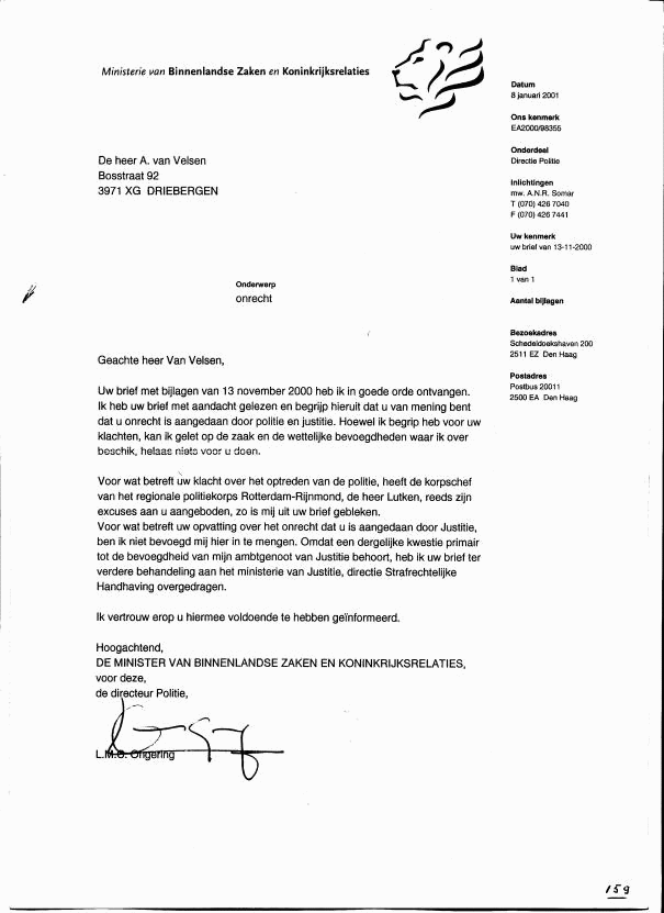 Aan: de Directeur van Politie Geachte Mevrouw: Verwijzend naar de informatie die ik U heb doen toekomen meen ik U, als verantwoordelijk directeur van de Politie en op grond van de morele rechtvaardigheid voldoende op de hoogte te hebben gebracht van het crimineel gedrag van genoemd politie personeel. Aangezien mijn eer en respectgevoel mij niet toelaten om lijdzaam toe te zien hoe politie en justitie deze onverkwikkelijke zaak onder tafel schuiven, mijn brieven niet beantwoord worden of, zoals bij U het geval is afgeschoven worden op andere verantwoordelijken die niet verantwoordelijk willen zijn, zal ik mijn protest hieromtrent uitbreiden tot U ,en Uw buren en bekenden. Weliswaar is er een mogelijkheid om tot een oplossing te komen gecreëerd door de Off. v. Justitie die mij enige malen privé heeft getelefoneerd en wil zien of het mogelijk is om mij op mijn verzoek in de gevangenis te laten wonen, dit omdat het voor mij onmogelijk is om met dit hypocriete en crimineel politie en justitie beleid nog te functioneren. Dit is m.i. de enigste wijze om op een acceptabele manier dit probleem op te lossen, aangezien rechtvaardige rehabilitatie, eerherstel en schadevergoeding vreemd genoeg alleen bij overheidspersoneel toegepast wordt. Ik zal om een plaats in de gevangenis te verwerven binnenkort alle betrokkenen en verantwoordelijken binnen hun buren , bekenden en relatiesfeer benaderen, en hun schaamteloos gedrag ter sprake brengen.