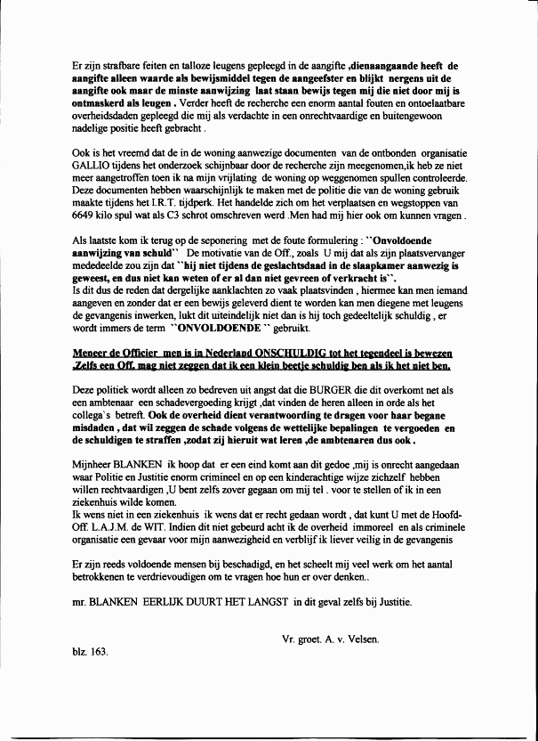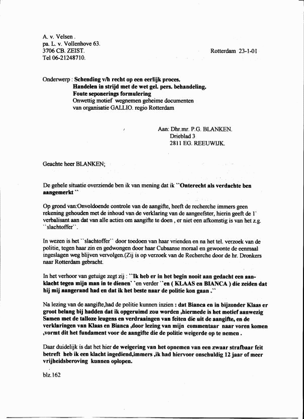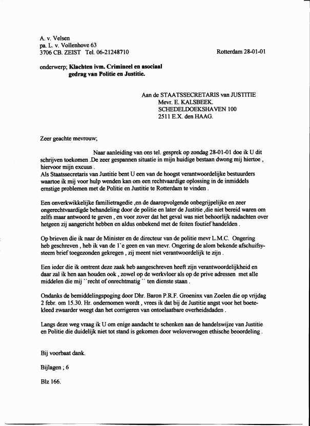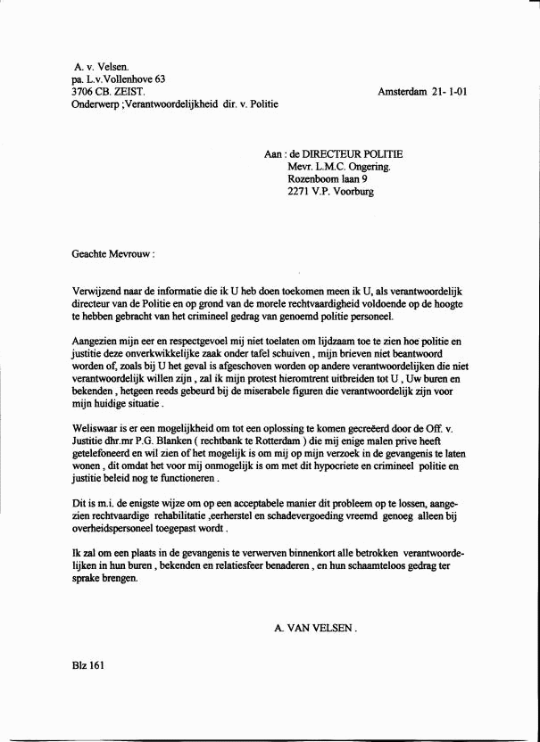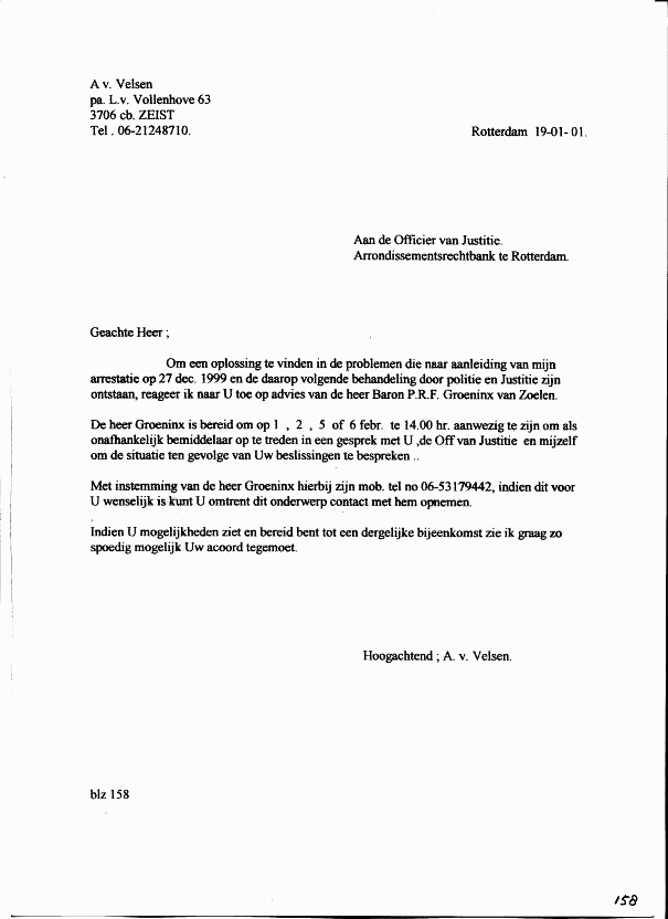 Rotterdam 26-01-01 P.a. L. v. Vollenhove 63 - 3706 CB ZEIST Onderwerp; bemiddelingsaanbod van de weledele heer Baron P.R.F. Groeninx van Zoelen in de conflictsituatie tussen het ministerie van Justitie en van Velsen. Voorbereiding op de bespreking met de officier van Justitie dhr. Mr. P.G. Blanken als vertegenwoordiger van de veroorzakers van de impasse in deze rechteloze ontwikkelingen. Op 27-12-99 ben ik opgepakt door de zedenpolitie (recherche) te Rotterdam. Op 30-12-99 ben ik "in voorlopige vrijheid gesteld" door de Rechter-commissaris. Vervolgens heb ik als gevolg van het criminele optreden van de recherche een groot aantal klachten tegen het politieoptreden omschreven en met behulp vav mijn advocaat bij de politie en vervolgens bij de korpsbeheerder (de Burgemeester) ingediend. Deze klachten werden aanvankelijk door de verantwoordelijke functionarissen op een ontmoedigende, leugenachtige wijze alsnog gegrond verklaard. Volgens de officier v. Justitie mr. Blanken is Justitie niet op de hoogte van bovenstaande klachtenprocedure en het resultaat hiervan geweest. De fouten van de recherche waren van fundamenteel belang voor de beoordeling door de off. v. Justitie, de duur van zijn onderzoek en de door mij bestreden sepotcode. Indien het onderzoek degelijk en eerlijk was uitgevoerd had de hulpofficier Harrold Stap nooit de moeite genomen om de zaak door te verwijzen naar Justitie, het was dan niet tot de gewraakte seponering gekomen, dus ook niet tot al deze problemen. Op grond van bovenstaande is het onterecht geweest dat er voorlopige hechtenis op mij van toepassing is geweest en alle activiteiten die daarop volgden zijn volstrekt onnodig belastend voor alles en iedereen geweest. In een bekende zaak waarin ook sprake was van aangifte betreffende een dergelijke smerige verdachtmaking is ook sepotcode 1 wegens onterecht als verdachte aangemerkt toegepast, dus als de officier aanvoert dat het onmogelijk is dat ik onterecht als verdachte ben aangemerkt omdat er wel een aangifte, dus bewijs voorligt spreekt hij niet de waarheid en meet met twee maten. Op de mededeling van de off. v. Justitie mr. Blanken dat hij niet kan weten of ik mijn vrouw wel of niet verkracht zou hebben omdat "hij niet in de slaapkamer is geweest" antwoord ik dat niemand van een officier van Justitie kan verwachten dat hij een oordeel geeft over iets dat hij niet kan weten. Waarom gebeurt en probeert hij dit dan tegen beter weten in? Zoals ik niet kan en wil weten en verklaren of de off.v. Justitie zijn vrouw onlangs heeft verkracht, dien ik mij van een oordeel te onthouden, de off. daarentegen oordeelt dat er "onvoldoende" bewijs is, wat inhoud dat er bewijs is doch onvoldoende om mij voor de rechter te krijgen. Hij motiveert zijn oordeel op leugens in een valse aangifte. De aangifte bevat voldoende leugens om strafbare feiten te kunnen vaststellen die aangeefster een proces verbaal opleveren kunnen, ik heb aangifte willen doen, doch dit werd geweigerd, hieruit kan alleen de vooringenomen handelswijze van politie en Justitie afgeleid worden. Meneer de officier men is in Nederland ONSCHULDIG tot het tegendeel is bewezen, ook een OFFICIER van Justitie mag dus niet zeggen dat ik een klein beetje schuldig ben. De door U bedreven werkwijze komt voort uit angst dat er soms een burger een rechtvaardi- ging en een schadevergoeding krijgt en bewezen word dat betrokken ambtenaren fouten en crimineel gedrag te verwijten zijn. Ook de overheid dient verantwoording te dragen voor haar begane misdaden, schade te vergoeden en de schuldigen te bestraffen, zelfs als dit overheidsfunctionarissen zijn. Mijnheer Blanken, ik hoop dat er een eind komt aan dit gedoe, mij is bij herhaling zwaar onrecht aangedaan door Justitie en dit was de limit. Politie en Justitie hebben op criminele en kinderachtige wijze zichzelf willen rechtvaardigen, U bent zelfs zover gegaan dat U mij telefonisch voorstelde om in een ziekenhuis te komen i.p.v. in de gevangenis. In een ziekenhuis wil ik niet, want ik ben niet gek, dat bedoelde U immers, ik wijs U op het oordeel van de gerechtspsychiater dhr. D v/d Meer die op 07-01-00 evenals psychiater dhr. Schouten en Gerrittse van de T.B.S. kliniek te Utrecht bevestigen dat ik niet gek ben doch zeer belast met deze beschuldigingen. Ik wens dat mij recht gedaan wordt, dat kunt U en de hoofdoff. Mr. L.A.J.M. de Wit. Indien dit niet gebeurd acht ik de overheid immoreel en als criminele organisatie in staat om mij volgens de gewoonten van een totalitair systeem binnen onze democratische samenleving in een gekkenhuis onschadelijk te maken voor Uw praktijken Justitie is een gevaar voor mijn aanwezigheid en omgekeerd in de huidige maatschappij, en daarom is het mijn wens om hier een einde aan te maken door in de gevangenis te komen, gezien mijn huidige situatie is het door toedoen van Justitie onmogelijk voor mij om uit Nederland weg te gaan. Rest nog de oplossing een eind aan mijn leven te maken op een manier die de waarheid publiekelijk aan het licht en ter discussie zal brengen. De meest voor de hand liggende manier is een plaats in de gevangenis en ik ben bereid om Fl. 20,-- per dag te betalen als bijdrage in de onkosten voor deze dienstverlening onder voorbehoud dat men mij dan ook met rust laat. Doel van de bijeenkomst vrijdag 02-02-01 is mijnerzijds om Justitie mijn standpunt kenbaar te maken en de volgende oplossingen aan te bieden; |