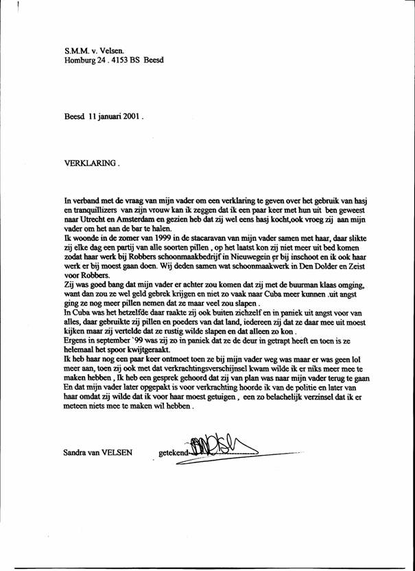 Driebergen 29-05-01 A. v. Velsen.Lijst van punten die van belang zijn voor de aangifte tegen mijn vrouw; Ana Cristina Bover van Velsen, geb. 14-08-1966 te Havanna Cuba. Na twee eerdere huwelijken met mij gehuwd te Havanna op 07-12-1993. Op 27 en 28 december 1999 heeft mijn vrouw bij de politie te Rotterdam aangifte gedaan tegen mij van verkrachting en wederrechtelijke vrijheidsberoving. De aangifte op zich vermelde tevens poging tot doodslag, doch later bleek dat dit er uit vooringenomenheid en piëteit voor het "schijnbare slachtoffer", door de hulp officier van Justitie dhr. Harrold Stap bij gefantaseerd was, om mijn situatie als verdachte nadelig te beïnvloeden. De aangifte bestaat uit een groot aantal leugens en verdraaide weergaves van feiten met als doel mij in de gevangenis te doen belanden. De motivatie van deze daad is om de door mij betaalde boerderij in Cuba (zie foto`s) zonder mijn verdere bemoeienis in handen te krijgen (door de moeder van het z.g. slachtoffer). Om de waarheid omtrent de aangifte boven tafel te krijgen heb ik t.b.v. mijn verdediging commentaar gegeven op de aangifte (bijl. Rood, blz 8 t/m 19). Ook van de verklaringen van (?? de getuigen ??) Bianca van Zutphen (bijl. Rood, blz. 20 t/m 24) en Klaas Dronkers (bijl. Rood, blz. 30 t/m 33) heb ik een commentaar gemaakt (bijl. Rood, resp. blz. 25 t/m 28 en blz. 34 t/m 37). Aanvullend op het commentaar op de aangifte, en het daaropvolgend getuige verhoor, wat reeds voldoende zegt over de betrouwbaarheid van aangeefster, heb ik een aantal brieven van aangeefster, haar kinderen en een groot aantal omwonenden en functionarissen bijgevoegd, die anders verklaren omtrent mijn gedrag en karakter t.o.v. mijn vrouw en haar kinderen. (bijl. Zwart) Hoofd off. v. Justitie Mw. Mr. A. Travieso (Zwart 15). Onze huishoudster Felina Hernandez (Zwart 14). Stadsraadslid Mw. Dolores Mendez (Zwart 13). Een verklaring van Mw. Cristina van Velsen Leon (zij weigert hier de naam "Bover" van haar vader te gebruiken) met een vreemde weergave van een in haar ideeën gepasseerd voorval, de tekening en de scheldwoorden zijn een voorbeeld van wat er in haar hoofd omgaat. (bijl Zwart 12) De tegenstrijdige verklaringen omtrent het gebruik van verdovende middelen en pillen geven aanleiding om de resten van peuken en de asbak met de voor hetzelfde doel gebruikte fanta blikjes voor onderzoek of confrontatie met de betrokkene aan te bieden. (zie bewijsmiddel 1) Ontkenning van haar gebruik van verdovende middelen wordt tevens ontmaskerd als leugen door de verklaring van dhr. Jhr. J.J.G. Groeninx van Zoelen, (bijl. Zwart blz 61), de verklaring van mevrouw. Teresa Izquierdo die medicijnen studeerde en een zeer behulpzame vriendin van Cristina is. (bijl. Zwart blz 3+4) en van Sandra mijn dochter (bijl. Zwart blz 5 + 8 ) Blz 216 A Hetzelfde geldt voor de kalmeringspillen (zie bewijs 2), en een cassettebandje (zie vertaald bewijs 3) waarin zij uitgebreid over deze onderwerpen sprak, wat veelal werd bijgewoond door een wederzijdse vriend, de heer Willem Peters. (bijl. Zwart blz 6 +9 ) Haar later toegegeven leugenachtigheid omtrent het "ontsnappingsverhaal" kan ik nog verder onderbouwen door de buskaart op de dag dat wij samen van huis gingen naar het station op 2e kerstdag, en het feit dat haar vrienden verklaren dat zij op 21 Dec. af hadden gesproken om op de dag van de "ontsnapping" met Cristina elders een kerstdiner (galgenmaal) te houden. (bijl. Rood blz 22 punt 18) Aangeefster zou hebben gevochten en geschreeuwd tijdens de vermeende misdaden, alvorens te kunnen vluchten. Dit wordt weerlegd door het feit dat, ondanks de dagen durende vermeende misdaden, geen geschreeuw of andere vreemde geluiden gehoord zijn door de omwonenden. Er zijn geen kleren of meubelen beschadigd (bijl. Blauw blz 2 ), ook heeft zij geen pogingen gedaan te vluchten toen wij enige malen naar Cuba hebben getelefoneerd in de tel. cel op straat, tijdens het bezoek aan de supermarkt, of toen wij bij de chinees eten gingen halen en zij een Chinese waaier kreeg. (zie bewijsstuk 4). Het OM is wettelijk verplicht om alle bewijs, zowel ten nadele als ten voordele van verdachte, te verzamelen. (bijl. Blauw blz. 1-A t/m 1-E ). In tegendeel Politie en Justitie hebben het onderzoek gefrustreerd. In tegenstelling tot hetgeen aangeefster verklaard, geeft mijn dochter, waarvan de recherche verwachte dat zij een verklaring tegen haar vader zou afleggen, een totaal andere visie van de gebeurtenissen weer. (bijl. Zwart blz. 8) De vader van de aangeefster geeft in zijn verklaring weer dat hij naar Nederland wil komen om nader te verklaren. Zijn verklaring geeft met name weer dat aangeefster reeds eerder omtrent dit onderwerp medisch werd behandeld. (bijl. Zwart blz 7) De uitwijzing uit Cuba, die ondanks mijn dringende vragen hierover tot nu toe zonder enige reden is gebleven, maakt duidelijk welke belangen en invloed de moeder van aangeefster beweegt en benut om, nu ik niet in de gevangenis terecht ben gekomen, mij met alle middelen uit Cuba te weren, ter behoud van de van mij afgenomen bezittingen (zie brief aan de Cubaanse Ambassade en kopie van ticket en retour bewijs (i.v.m. beschadigde bagage). (bijl. Zwart blz 10 ) Bianca (Rood, zie blz 22 punt 19) en alsmede Klaas (Rood zie blz 32 punt 36) verklaren wederom dat zij reeds op 21 dec. afgesproken hadden dat aangeefster op 2e kerstdag naar haar vrienden zou terugkeren. Ook het verhaal over het "bepaalde treinstation in Utrecht" en zij hieruit begreep dat Klaas, Cristina daar op zou halen is samen met de afspraak om bij hun kennissen te gaan eten en overnachten in Alphen aan de rijn, bewijs te noemen dat de z.g. ontsnapping of welke benaming men er ook aan geven wil, een vooraf geplande afspraak is geweest. A. v. Velsen. Blz 217.B