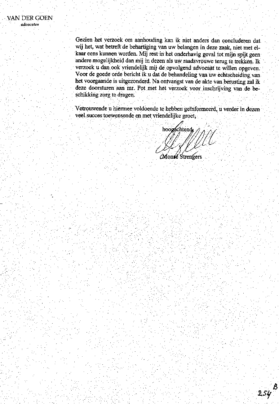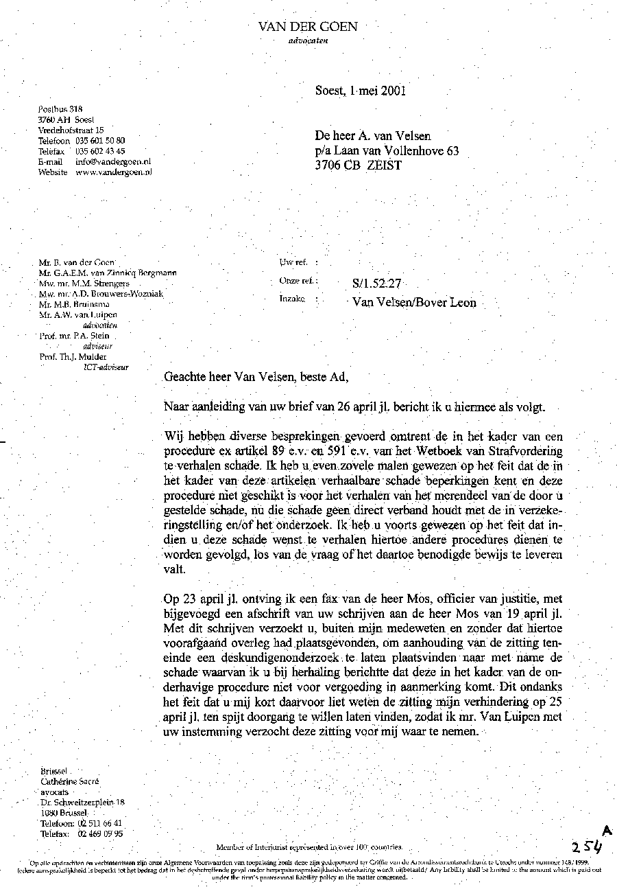 Aan v.d. Goen Advocaten. Geachte mevrouw Strengers, Met alle respect voor uw standpunt het niet met mij eens te zijn wat betreft mijn denkwijze omtrent het betrekken van de resultaten van mijn aangifte tegen de aangeefster in deze zaak, blijf ik, en tevens de officier, van mening dat vervolging van aangeefster de zaak, ook met betrekking tot schaderegeling en sepot 01, een belangrijk andere kijk op de zaak zal geven. Dat het een met het ander verweven is, bleek uit het schade vergoedingsverzoek dat U indiende bij de rechtbank, daar zaten nl. ook reis en andere kosten in verwerkt die niets met de aanhouding maar alles met de gevolgen op langere termijn te maken hadden. Ook de gevolgen van het latere gedrag van politie en Justitie wat betreft ongerechtvaardigde ontkenning, leugen en diefstal waar ik mij zeer druk over heb gemaakt, is duidelijk van invloed op de formulering van het schadeverzoek, wat thuishoort in een ander verzoek tot schadevergoeding. Zoals de Officier tijdens de zitting terecht naar voren bracht zijn er een aantal zaken die niet relevant zijn aan de directe schade als gevolg van de hechtenis, en tevens niet goed onderbouwd zijn. Dit kan nadelig zijn, omdat enerzijds de rechtbank de schade niet zal toekennen, en anderzijds tijdens een relevante verhaalsprocedure de kans bestaat dat het niet word toegekend omdat, het reeds vermeld word in deze procedure. U stelde mij voor om mij bij te laten staan door Mr. Luipen daar U zelf verhinderd was, en dat wij voor aanvang der zitting nog een korte voorbespreking zouden hebben. Ik heb U zoals gemeld in mijn brief van 26-04-01 van mijn voornemen op de hoogte gesteld, en meende dat de voorbespreking mede over dit onderwerp zou gaan.Dat deze zaak geen makkelijke zaak is doordat ik nu eenmaal rechtvaardigheid zoek en hierin tot het uiterste ga is reeds lang bekend, maar wat mij zeer verbaasd is dat u Uw jas aan de kapstok hangt exact 1 dag voor de zitting en hierover geen overleg met mij heeft willen voeren, terwijl de zaak al gewonnen is, alleen de vlag moet er nog op wat erkenning betreft. Het is niet Uw, een beetje mijn, en veel schuld van Justitie die in haar weerzin om tot rechtvaardige schaderegelingen over te gaan deze ondemocratische en discriminerende barricaden heeft opgeworpen voor de burger. Wat betreft de ontoelaatbare daden van de politie en de vertraagde vervolging van aangeefster is de zaak inmiddels persoonlijk in handen van de minister. I.v.m. de eisen van de rechtbank omtrent de tekortkomingen in het schadevergoedingsverzoek zal ik e.e.a. zelf toelichten, en hoor ik graag zo spoedig mogelijk wanneer de dossiers opgehaald kunnen worden. Vriendelijke groet,