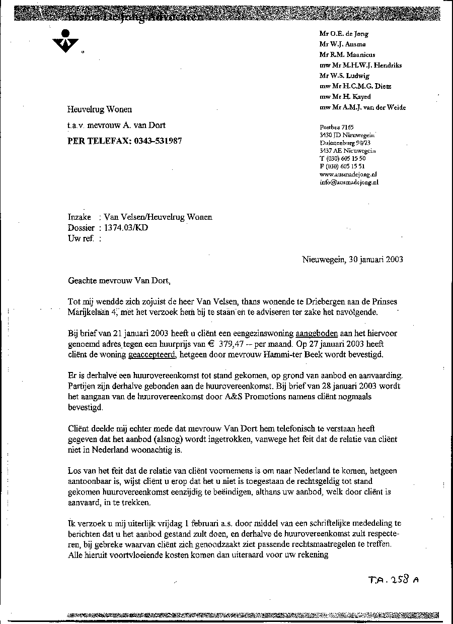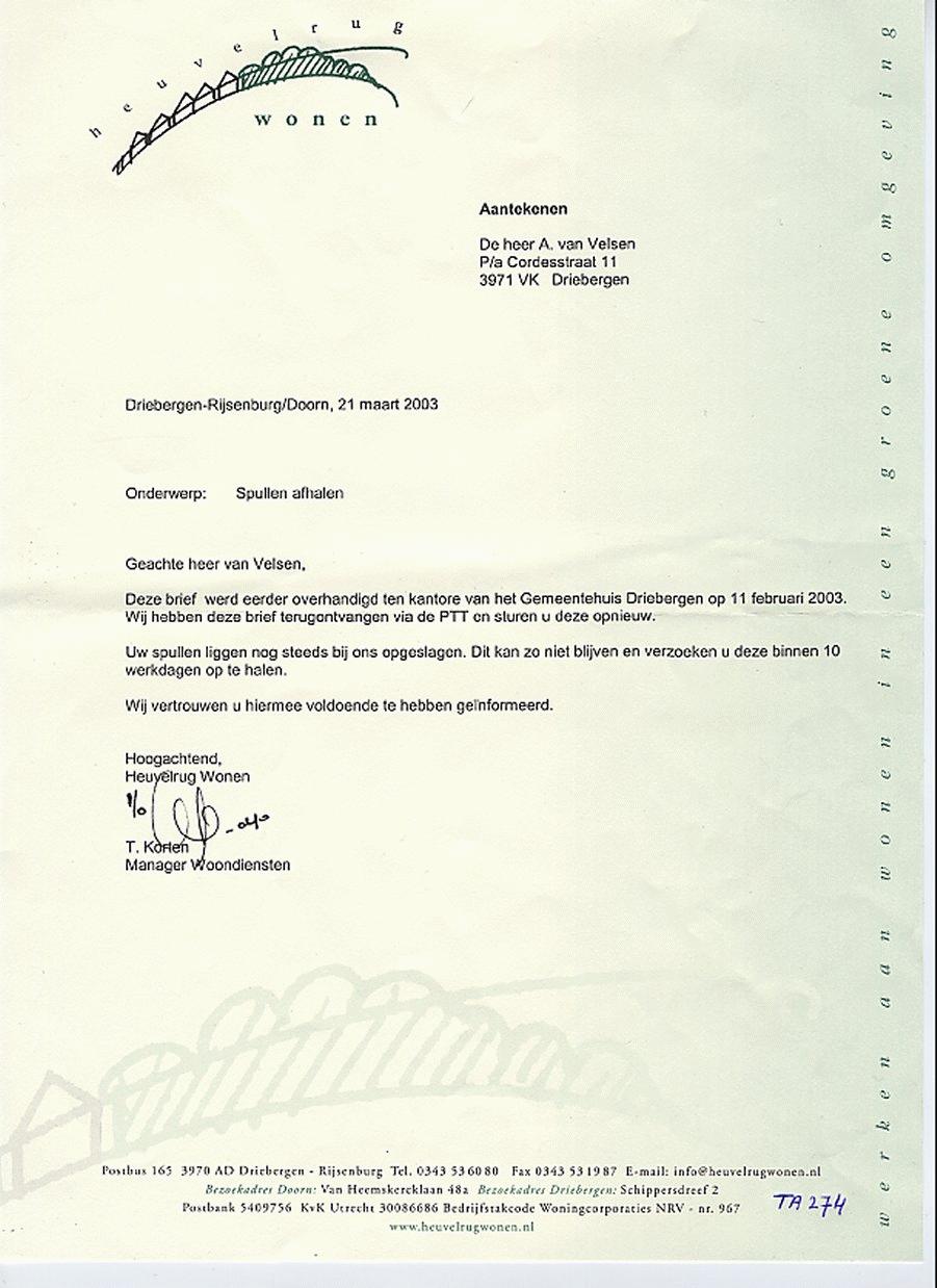 Aan de; Gemeente Rotterdam. Onderwerp; ontoelaatbare overheidsdaden. Geachte heer van der Tak, N.a.v. het tel. gesprek vandaag met Uw secretaresse, doe ik U een map toekomen waaruit een groot aantal ontoelaatbare overheidsdaden vermeld worden, waardoor ik erg ben geschaad. Weliswaar zijn deze daden in principe geheel toegegeven door de Burgemeester, doch met de grootste minachting en met gebruikmaking van bedrieglijke verdraaiingen met als doel de verantwoording van de gebeurtenissen op een moreel en sociaal onaanvaardbare wijze te ontkennen. De handelswijze van de burgemeester, politie en Justitie druist in tegen datgene wat de rechtstaat voorstaat, en staat in schrille tegenstelling tot de moraalprediking van B&W van Rotterdam ten aanzien van het gedrag wat de oud Burgemeester Bram Peper presenteerde. Om welke reden verwachten B&W van de burger, o.a. Bram Peper, teruggave van onterecht ontvangen gelden op grond van morele principes, terwijl diezelfde B&W alle fatsoensnormen en morele beginselen die ons land met het predikaat "RECHTSTAAT" hebben bestempeld, in mijn geval asociaal en onhumaan negeren. De ernst van de gebeurtenissen hebben mij doen besluiten om dit onrecht in geen geval te accepteren, wat het offer ook zal zijn. Tweemaal heb ik op een punt gestaan om mijn leven te geven om op dit gebied een meer rechtvaardiger beleid tot stand te helpen brengen, doch kennissen gaven aan dat het resultaat de prijs niet waard was. Te weinig hoge functionarissen waren persoonlijk betrokken bij dit schandaal, hetgeen nu anders ligt, bovendien ligt het excuus dat ik gek zou zijn nu wezenlijk moeilijker. Hierbij leg ik de verantwoording voor de gevolgen van de onbestrafte strafbare feiten door de politie begaan, de door incompetentie en vooringenomenheid tot stand gekomen onterechte aanhouding en arrestatie, en het ongepaste stilzwijgen en de onwil van de Burgemeester als korpsbeheerder om deze kwestie op een eerbare wijze op te lossen, in handen van B&W. Ondanks moeilijkheden en tegenwerking ga ik door en hoop op Uw medewerking, Bij voorbaat dank, vriendelijke groet, Hoogachtend,