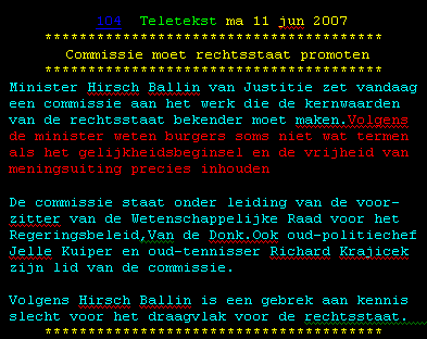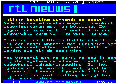 Helemaal verbazingwekkend was na onze recente brief van 25 mei 2007 naar Antoinette Hertzenberg van het consumenten programma TROS Radar het een week later uitgegeven persbericht van 1 juni 2007. Wat met een lawine van brieven in de afgelopen 5 jaar naar de 2e SLAAPkamer, Justitie, Commissie van Wijnen , hoogleraren, advocaten en rechters in hun ivoren torens etcera niet is gelukt werd in dit persbericht een 'NO WIN NO FEE' aangekondigd. Rechtzoekenden zijn bij het verliezen van de procedure geen advocaatkosten meer verschuldigd. De lijst van advocaten die hun medewerking aan de 'NO WIN NO FEE' regeling geven zien wij dan ook gaarne tegemoet. Wat het verschil met het 'NO CURE NO PAY' systeem is, wat merkwaardig een jaar geleden nog verboden werd door ex-justitie minister Jan Piet Hein Donner, ontgaat ons. In ieder geval is met deze 180 graden draai de 'NO WIN NO FEE' regeling een stap in de goede richting. Logisch geredeneerd zou het procesmonopolie meteen ook kunnen worden afgeschaft.