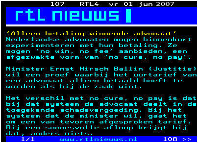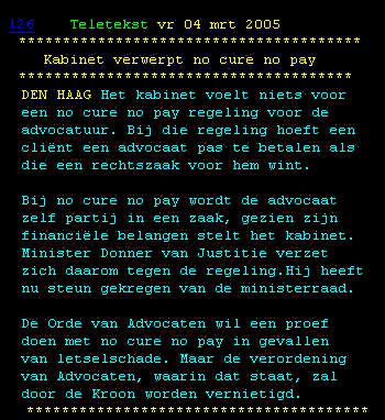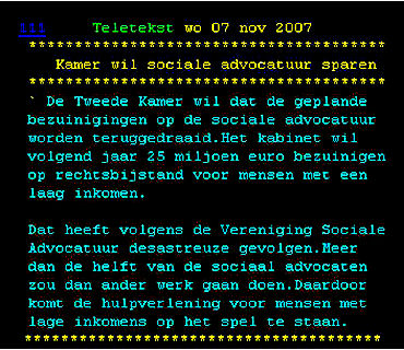 (*) Een PRO DEO ??? advocaat verdient per jaar bij fulltime werk circa € 142.500.- (1500 arbeidsuren x € 95 /uur). Veel teweinig vindt de "sociale advocatuur" en dreigt de hulpverlening voor rechtzoekenden met lage inkomens te staken. (zie teletekst 7 nov. 2007)