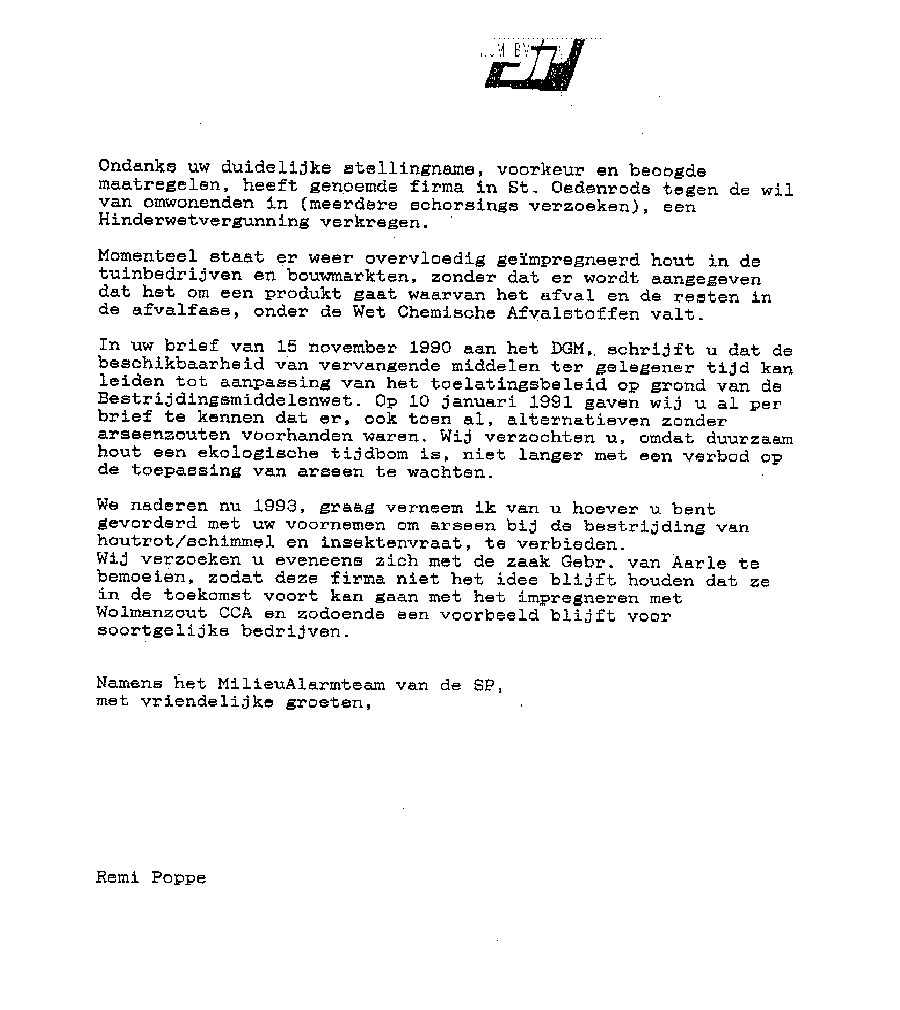 Juist om die reden heeft de voormalige minister van VROM (de heer J.G.M. Alders) bij brief van 21 januari 1991, kenmerk: SR/29N0274, aan Remi Poppe van de Socialistische Partij laten weten dat met koper, chroom en arseen verduurzaamd hout dat in de afvalfase is beland, inderdaad als chemisch afval moet worden verwijderd en verwerkt. Een kopie van die brief vindt u bijgevoegd (bijlage 1).