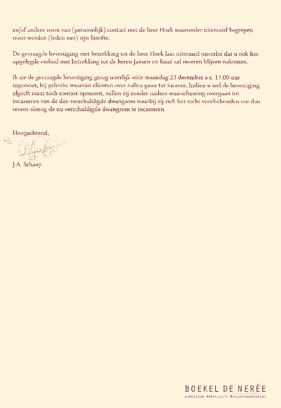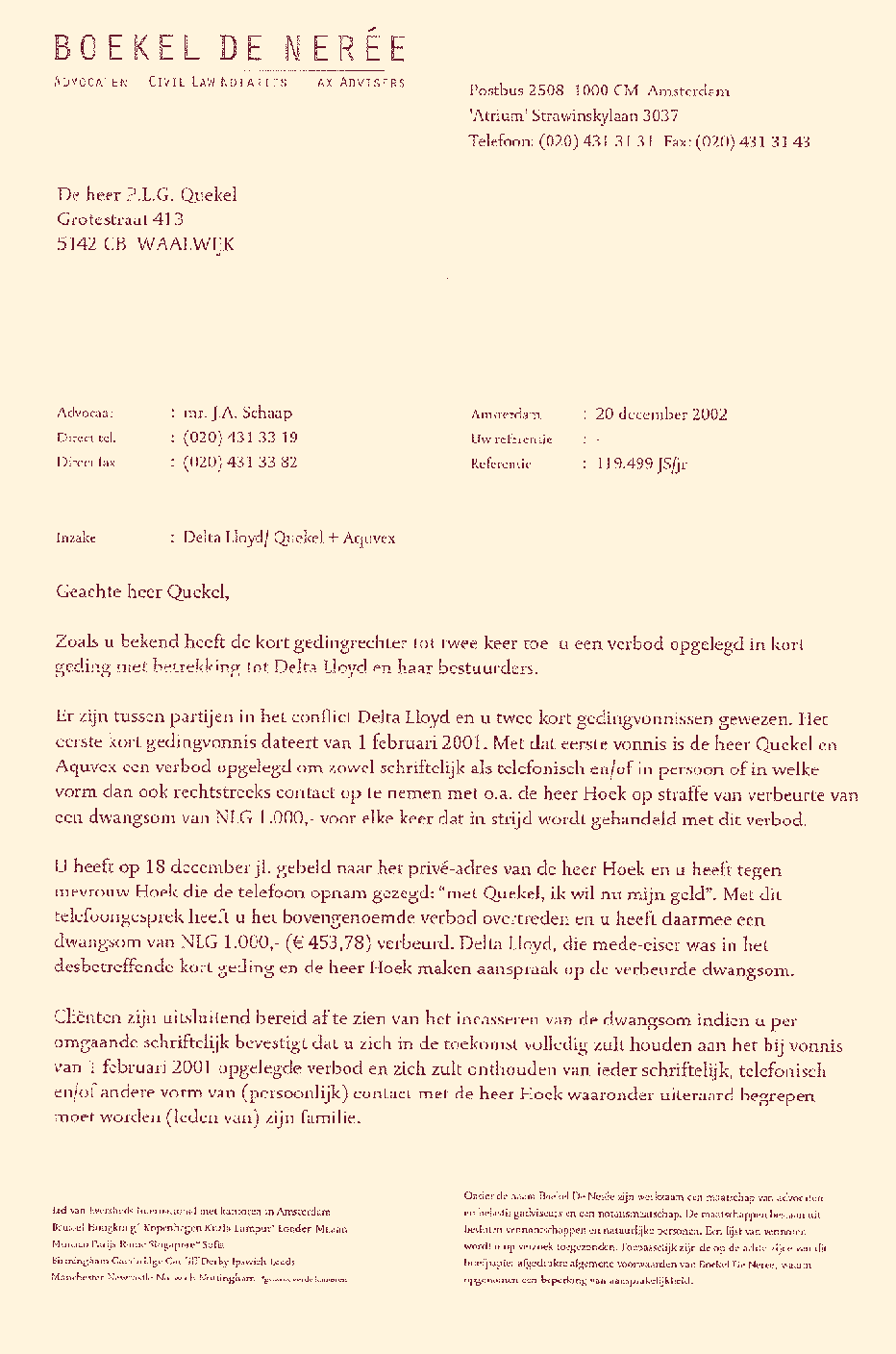 In goede orde ontving ik uw brief van 20 december jl. Is de familie Hoek, althans mevrouw, bevangen door een Kerstgedachte? Spierpijn van overtolligheid van massale kerstinkopen wekt deernis en het besef aan gene zijde dat een klein kalkoentje voor onze familie er ook dit jaar weer niet inzit. Een niet gepleegd telefoontje vormt een begin van inkeer. Het zijn immers veelal juist de vrouwen die moed aan moraliteit weten te paren. Een vertraagd doorgekomen morele achtervolgingswaan? Reminiscentie van geweten, dat door macht van het eigenbelang het stilzwijgen is opgelegd? Ik weet het allemaal niet. Wat ik wel weet: ik heb huize Hoek niet gebeld. Noch met de heer Hoek. Noch met mevrouw Hoek. Mogelijk is een speudo - Quekel in het geding, die gedachten kan lezen; maar ik heb niet gebeld. Uw valse aantijging beschouw ik in hoge mate als defamerend en derhalve als smaad. Hoe komt u erbij dat ik gebeld zou hebben? Waar is dat op gebaseerd? Is deze fantasie ontsproten aan een mega-brein, dat naarstig op zoek is naar versterkende bouwstenen die de neerwaartse krachten bundelen in de voor Delta Lloyd zo kansarme gevallen en procedures? Alvorens mij (wederom) vals te beschuldigen, had het op uw weg gelegen om de feiten na te gaan. Kunt u niet op eenvoudige wijze achterhalen wie volgens de beweringen op een bepaald tijdstip naar een bepaald telefoonnummer zou hebben gebeld? Misschien heeft een medewerker veiligheid van Delta Lloyd weer eens 'n verkeerd nummer gedraaid. Per ongeluk. Of "just testing". Onzorgvuldigheid is wederom troef bij Delta Lloyd. Wat de inhoud van de zaak betreft: hierbij zij verwezen naar de artikeltjes in BN de Stem, het NRC Handelsblad, het Financieel Dagblad en de Volkskrant van hedenmorgen. Ook de super PG is van mening dat het aangaan van een schikking gelijk staat aan het bekennen van schuld. Nog meer strafzaken bij de rechtbanken. Een stoer standpunt van de super PG die voor zijn O.M. toch al zovele zaken jammerlijk verloren ziet gaan. Moreel en publiekelijk was dat allang het geval, doch deze dimensie moest misschien nog juridisch geformaliseerd. Grondslag voor uitsluiting van aanbestedingen. Grondslag voor intrekken bankvergunning. De sticker 'crimineel' mag alleen geplakt met lijm van formaliteiten. Een opsteker voor Mr. Gisolf.