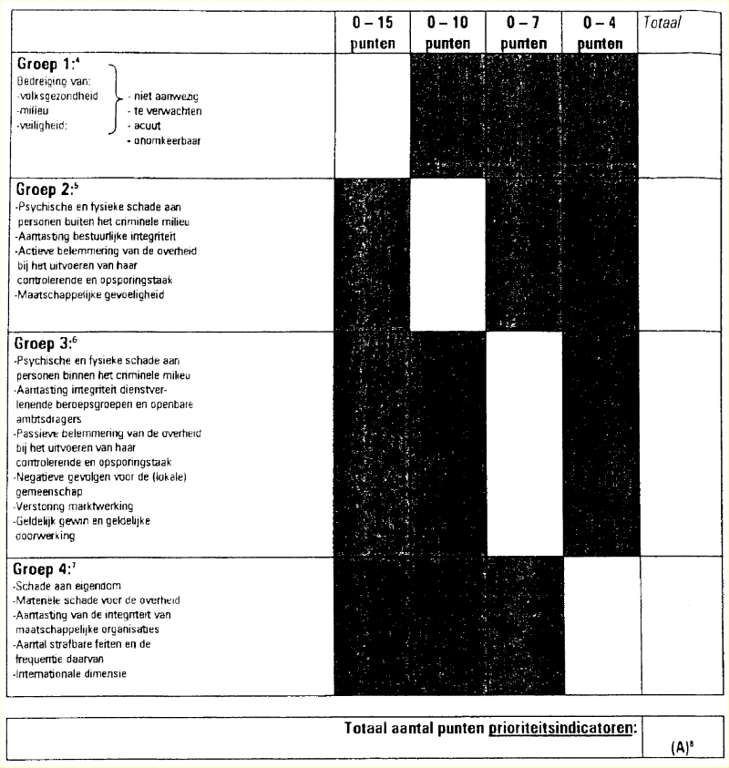 - Score groep 1: niet aanwezig 0. Te verwachten 5; acuut 10; onomkeerbaar: 15 punten. Hierbij dient in ogenschouw te worden genomen dat bij de afgesloten zaken achteraf is bekeken of de dreiging aanwezig was. Te verwachten was, acuut of onomkeerbaar was. Zo kan het zijn dat in eerste instantie de dreiging verwacht was, maar achteraf bleek dat deze dreiging ongegrond was. De score is dan 0. Bij lopende onderzoeken is dit logischerwijze nog niet van toepassing.