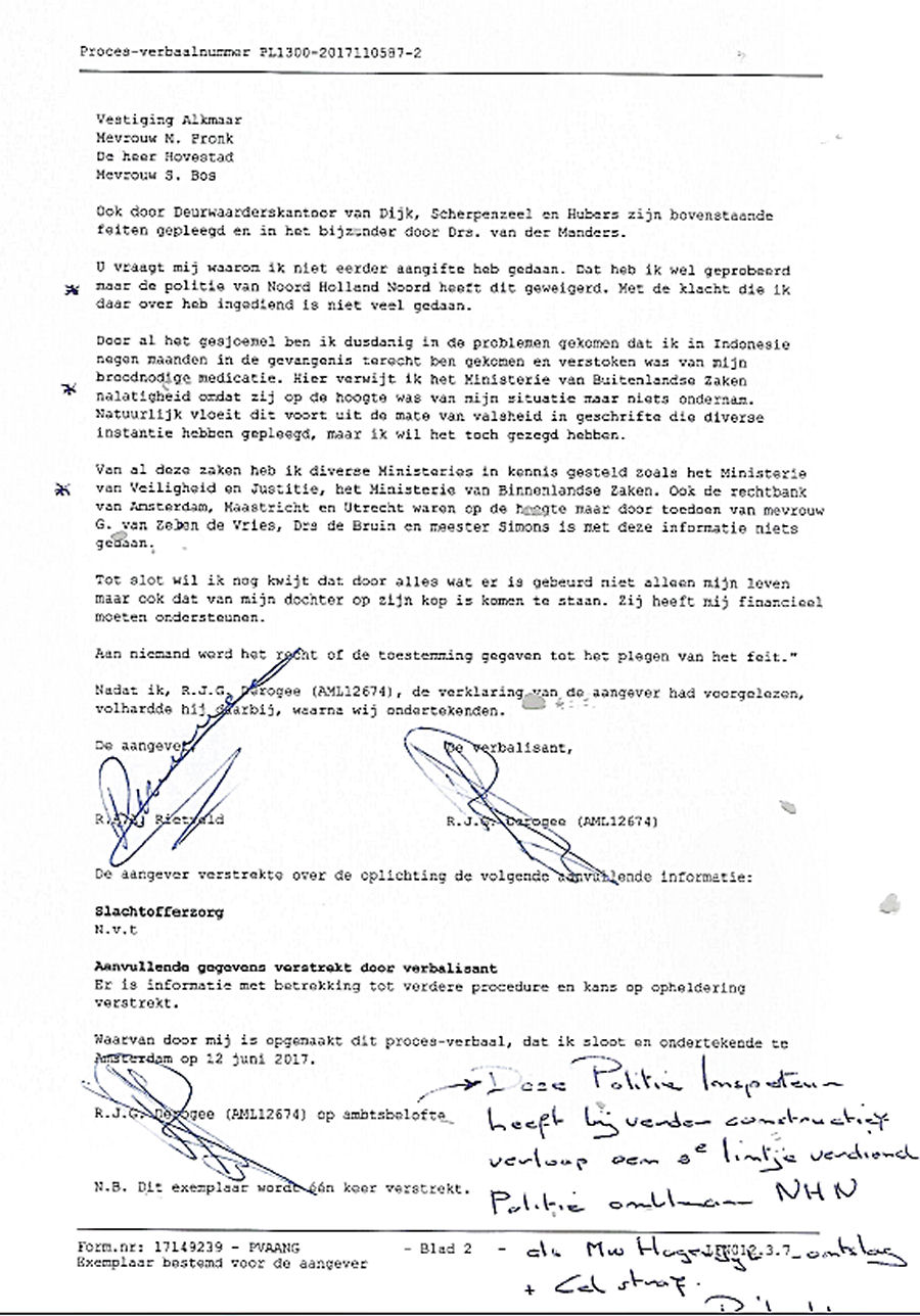 Wel verantwoordelijk, maar niet aansprakelijk zijn, gaat in deze affaire zeker niet op. Tot nu toe durft niemand vragen stellen. Ook de media niet! Vooral nu de RVD het stellen van vragen verbiedt. De aangifte bij de politie m.b.t. strafbare feiten waarvan bewijzen zijn bijgevoegd aan de aangifte, met een lijst van personen die aangesproken kunnen worden op hun verantwoordelijkheid om zelf aangifte te doen van strafbare feiten waarvan zij kennis dragen. Dit op de verplichting vanwege 162 Sv van het Wetboek van Strafvordering. Zie de aangifte tegen rechters en advocaten. Zolang politici en de pers blijven zwijgen, zullen per jaar ca. 500 mensen zelfmoord plegen.