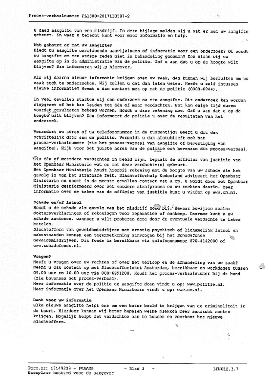 Wilt u mij de situatie en omstandigheden laten weten m.b.t. de door u al dan niet gedane aangifte van deze strafbare feiten, zoals die wettelijk verplicht zijn? Verder moet u niet en opnieuw denken dat u ook deze aangiften terzijde te kunnen leggen door nogmaals een onnozele brief te sturen en te melden geen aangiften te gaan doen, te negeren of eventueel alleen te archiveren !