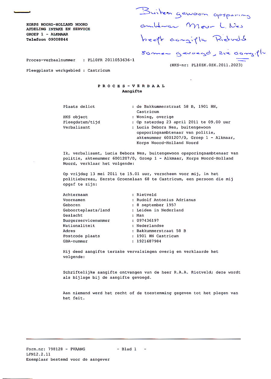 R.A.A. Rietveld. Zoals door G.R.M. v.d. Assum en A.P. Maes zowel in de door henzelf aangegeven in diverse processen verbaal, hoe tien jaar later hun samenzweringspraktijken nog steeds voortduren. Dit zijn advocaten die aangever Rietveld als wederpartij in 2001 ook in het openbaar in