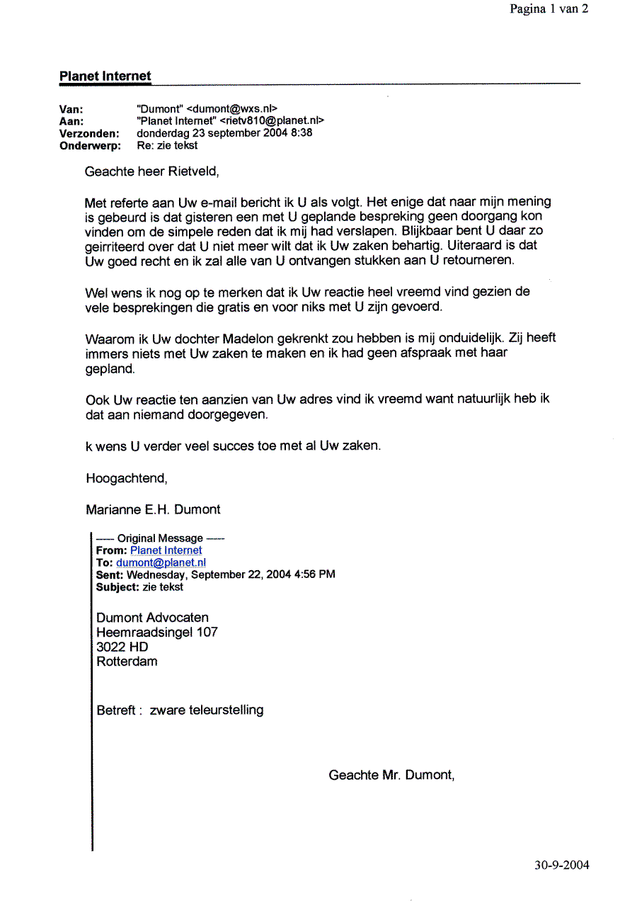Aangekomen in Rotterdam wacht ik nog voor de deur van het kantoor tot 9.15. Dat was al 15 min later dan Dumont had ingesproken. Toen kreeg ik in de auto een telefoontje van haar medewerkster, dat wegens enorme drukte van advocate Dumont