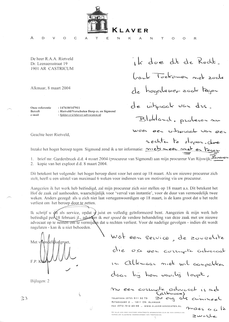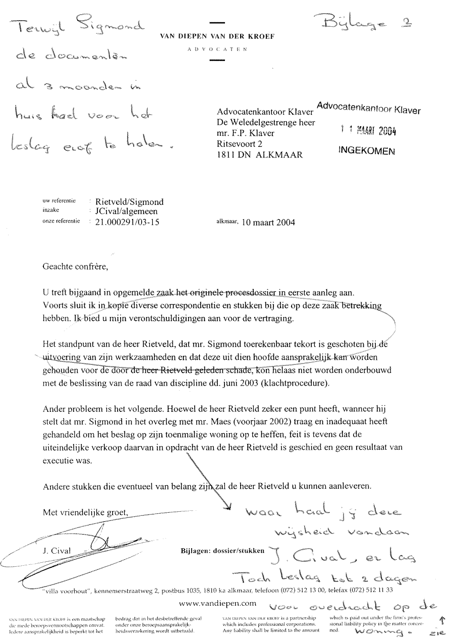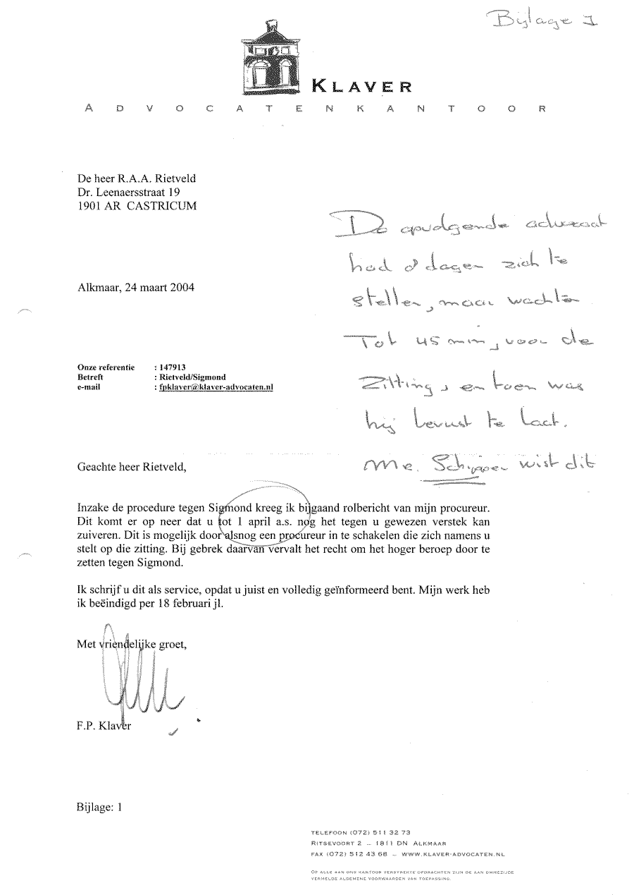 Verwijt aan mr. Sigmond over z'n inactiviteit. Wel betalen, maar niet kunnen halen!