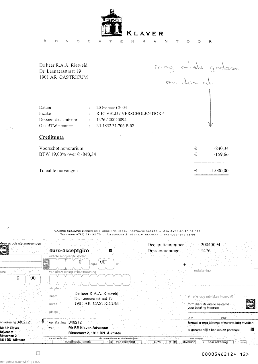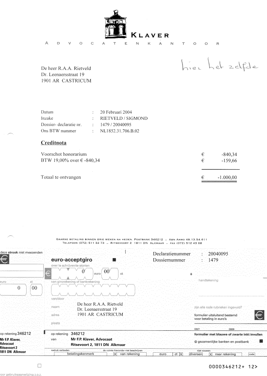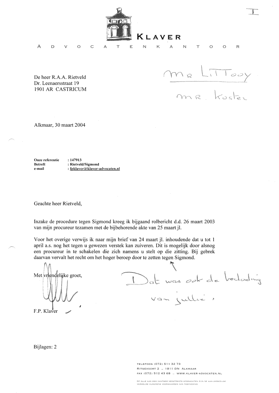 Verwijt aan mr. Sigmond over z'n inactiviteit. Wel betalen, maar niet kunnen halen!