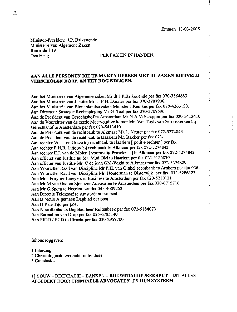 Minister-President J.P. Balkenende, (zie ook mijn laatste brief) PER FAX EN IN HANDEN AAN ALLE PERSONEN DIE TE MAKEN HEBBEN MET DE ZAKEN RIETVELD - VERSCHOLEN DORP, EN HET NOG KRIJGEN.