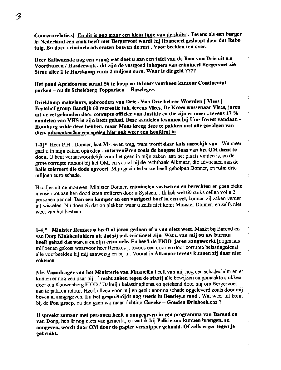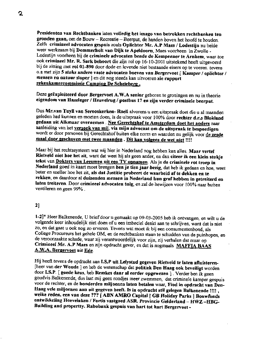 Hij heeft tevens de opdracht aan het ISP uit Lelystad gegeven om Rietveld te laten afluisteren- [de heer van der Woude] en ik heb de wetenschap dat politiek Den Haag ook beveiligd wordt door ISP. [ een goede keus overigens, en ik heb Remkes daar al eerder opgewezen ]. Verder ben ik geen goudvis meneer Balkenende, dus laat mij geen rondjes meer zwemmen. Dat criminele kampergespuis moet voor de rechter, en hen de honderden miljoenen belasting laten betalen, waarvoor de FIOD in opdracht van Den Haag vele miljoenen heeft uitgegeven voor onderzoek. Die opdracht stilgelegd meneer Balkenende !!! Met welke reden ?? Een van deze ??? [ ABN AMRO Capital - GB Holiday Parks / Bouwfonds ontwikkeling Hoevelaken / Fortis vastgoed ASR. De provincie Gelderland – HWZ – HBG-Building and property. Het Rabobankgespuis behoort van hart tot hart tot Bergervoets concernrelaties ] En dit is nog maar een klein tipje van de sluier. Verder, wanneer een burger in Nederland een zaak heeft met dan wordt hij financieel gesloopt door dat Rabotuig; en doen de criminele advocatenboeven de rest. Voorbeelden ten over. Meneer Balkenende, nog een vraag. Wat doet u aan een tafel van de Fam. van Drie uit o.a. Voorthuizen / Harderwijk ?? Dit zijn de vastgoedinkopers van de crimineel Bergervoet. Zie Stroe Allee 2 te Harskamp voor ruim 2 miljoen euro. Waar is dit geld ??? Het pand Apeldoornsestraat 56 stat te koop en te huur enwas voorheen het kantoor van Continental Parken – nu de Scheleberg – Hazeleger. Drieklomp makelaars, de gebroeders van Drie. Van Drie Beheer in Woerden [ Vlees ] Feytahof Group, Bandijk 60 is de recreatietak, tevens vlees. De Kroes Wassenaar, vlees, en is jaren uit de cel gehouden door corrupte officier van Justitie; en die zijn er meer, en heeft 17% aandelen van VHS in zijn bezit gehad. Deze aandelen kwamen bij Uni-Invest vandaan. Homburg wilde deze hebben, maar Maas kreeg deze te pakken met alle gevolgen van dien. Advocatenboeven spelen hier ook weer een hoofdrol in. 1-3]* Heer P.H. Donner, ik laat Mr. even weg, want wordt daar kotsmisselijk van. Wanneer gaat u in mijn zaken optreden en interveniëren zoals de hoogste baas van het OM dient te doen ?? U bent verantwoordelijk voor hetgeen in mijn zaken aan het plaatsvinden is, en de grote corrupte rotzooi bij het OM; en vooral bij de rechtbank Alkmaar die advocaten aan de balie tolereert die doden opvoeren. Mijn gezin hebben ze te barsten geholpen Donner, en ruim drie miljoen euro schade aangericht. Handjes uit de mouwen Minister Donner. Criminelen vastzetten en laten berechten en geen zieke mensen tot aan hen dood laten treiteren door u systeem. Ik kan wel 60 cellen vol krijgen met twee personen per cel. Dan het liefst een kamper en een vastgoedboef in een cel, dan kunnen zij de zaken verder uit wisselen. Nu doen zij dat op plekken waar u zelfs niet komt Minister Donner, en zelfs niet weet van het bestaan. 1-4]* Minister Remkes, u hebt al jaren gedaan alsof u van niets weet. U maakt bij Barend en van Dorp klokkenluiders uit dat ook zij crimineel zijn. Wat u van mij op uw bureau hebt gehad, dat ging over en zijn echte criminelen. Daar heeft de FIOD jaren aan gewerkt [nogmaals miljoenen gekost, waarvoor heer Remkes ?? ] Daarnaast een door en door corrupte Belastingdienst, en vele voorbeelden daarvan bij mij aanwezig en bij u. Vooral in Alkmaar kunnen zij rekenen. Ook Mr. Vaandrager van het Ministerie van Financiën heeft van mij nog een schadeclaim tegoed en er komen er nog een paar bij. [ rechtszaken tegen de staat ] Verder alle bewijzen en gemaakte stukken door o.a. Kouwenberg, FIOD / Dalmijn Belastingdienst en getekend door mijzelf om aan te pakken als retour. Het heeft alleen voor mij en gezin een enorme schade opgeleverd, zoals door mij boven al is aangegeven. En het gespuis rijdt nog steeds in Bentleys rond. Wat weer uitkomt bij de Pon Groep. Nu dan gaan wij maar richting Geveke – Gouden Driehoek, enz. ?? U spreekt zomaar met allerlei personen, zoals u heeft aangegeven in een programma van Barend en van Dorp. Nu, daar heb ik nog niets van gemerkt. En wat ik bij politie zou kunnen brengen en aangeven, wordt door OM door de papierversnipper gehaald. Of zelfs erger, tegen je gebruikt. 1-5}* Heer Taal, het zou een goede zaak zijn om niet wat u links binnenkrijgt aan documenten er rechts weer uit te donderen, en de burger zoals door heer Balkenende ook weer is geprobeerd als een goudvis in een kom rondjes te laten zwemmen. Ophouden en de documenten gebruiken en inzetten tegen criminelen. 1-6]* President Schipper, heb van u al een aantal malen documenten verkregen, waarin u stelt dat u voor de procedure essentiële documenten te laat hebt gekregen. Wanneer u deze wel op tijd krijgt en u toch niets kunt doen, maar wel dat toelaat dat criminele advocaten wederom rechters kunnen beliegen en bedriegen. U zou eens moeten proberen daar verandering in aan te brengen. En tevens de uitspraken in hogerberoepzaken zoals in mijn geval Rietveld / Verscholen Dorp uit te laten spreken als er nog wat uit te spreken valt. Maar ik denk net als bij de zaak professor van de Putten waar u nog mee gesproken hebt, en dat ook hier de oplichters wederom in het gelijke zijn en worden gesteld. Dit is door de heer Brockhus al eens eerder scherp maar zeer correct bij u onder de aandacht is gebracht. Maar ook hier kwam het goudvis-virus om de hoek. 1-7]* Mr. Van Tuyll van Serooskerken-Roell. U moet in de zaak met rol 1596/03 nog steeds een uitspraak doen. En dat betreft Verscholen Dorp criminelen versus Rietveld. Mijn vraag is, waarom u zolang nodig hebt om een uitspraak die door rechter drs. Blokland in Alkmaar al is uitgesproken (en wel zeer correct) over te nemen? Een van de weinige in Alkmaar overigens. Dit omdat deze rechter heel snel door had wat voor leugenachtige advocatengespuis hij voor zich had, en goed in zijn dossier kon terugvinden wat oplichter Maes en de verkeerde (met persoonsverwisseling) nota bene wederom voor leugens omhoog baggerde. Dit vind ik een respectabe