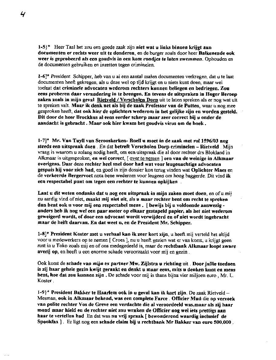 Presidenten van Rechtbanken laten volledig het imago van betrokken rechtbanken ten gronde gaan, om de Bouw– en Recreatie–beerput de hand boven het hoofd te houden. Zelfs het criminele advocatengespuis, zoals oplichters Mr. A.P. Maes en Lodestijn die beide weer werkzaam zijn bij Dommerholt van Dijk te Apeldoorn. Maes werkte voorheen in Zwolle en Lodestijn voorheen bij de criminele advocatenbende van de Kempenaer te Arnhem. Daartoe behoort ook de crimineel Mr. R. Sark die zijn rol op 16-10-2001 uitstekend heeft gespeeld bij de zitting op rol 01-890 door dode en levende en niet bestaande eisers op te voeren. tevens o.a. met zijn vijf andere vaste advocatenboeven van [ Kamper / oplichter / mensen en natuur sloper ] en die dit nog steeds kan uitvreten. Zie het rapport van de Rekenkamercommissie Camping De Scheleberg. Deze geëxploiteerd door de exploitant en nu in fictief eigendom van Hazeleger / Heuvelrug / postbus 17 en zijn verder criminele beerput. Dus Mr. van Tuyll van Serooskerken-Roell, alvorens u een uitspraak doet die u al maanden geleden had kunnen en moeten doen, is de uitspraak voor 100 procent over te nemen die door rechter drs. Blokland uit Alkmaar is gedaan. Nee, het Gerechtshof te Amsterdam doet het anders naar aanleiding van het verzoek van mij, via mijn advocaat om de uitspraak te bespoedigen wordt er door personen bij Gerechtshof buiten elke norm en waarden nu gelijk voor de zesde maal door geschoven met twee maanden. Dit kan volgens de wet niet !!!! Maar bij het rechtssysteem wat wij hier in Nederland nog hebben kan alles. Maar vertel Rietveld niet hoe het zit, want dat weet hij als geen ander, en dan citeer ik een klein stukje tekst van Dokters van Leeuwen uit een TV-opname. Als je de criminele rot troep in Nederland goed in kaart moet brengen ben je tien jaar bezig, dat heb ik gedaan en hoe, weet beter en sneller hoe het zit, als dat Justitie probeert de waarheid af te dekken en te rekken, en daardoor al duizenden mensen in Nederland hun graf hebben in getreiterd en laten treiteren. Door crimineel advocaten tuig, en zal de bewijzen voor 100% naar buiten ventileren en geen 99%.