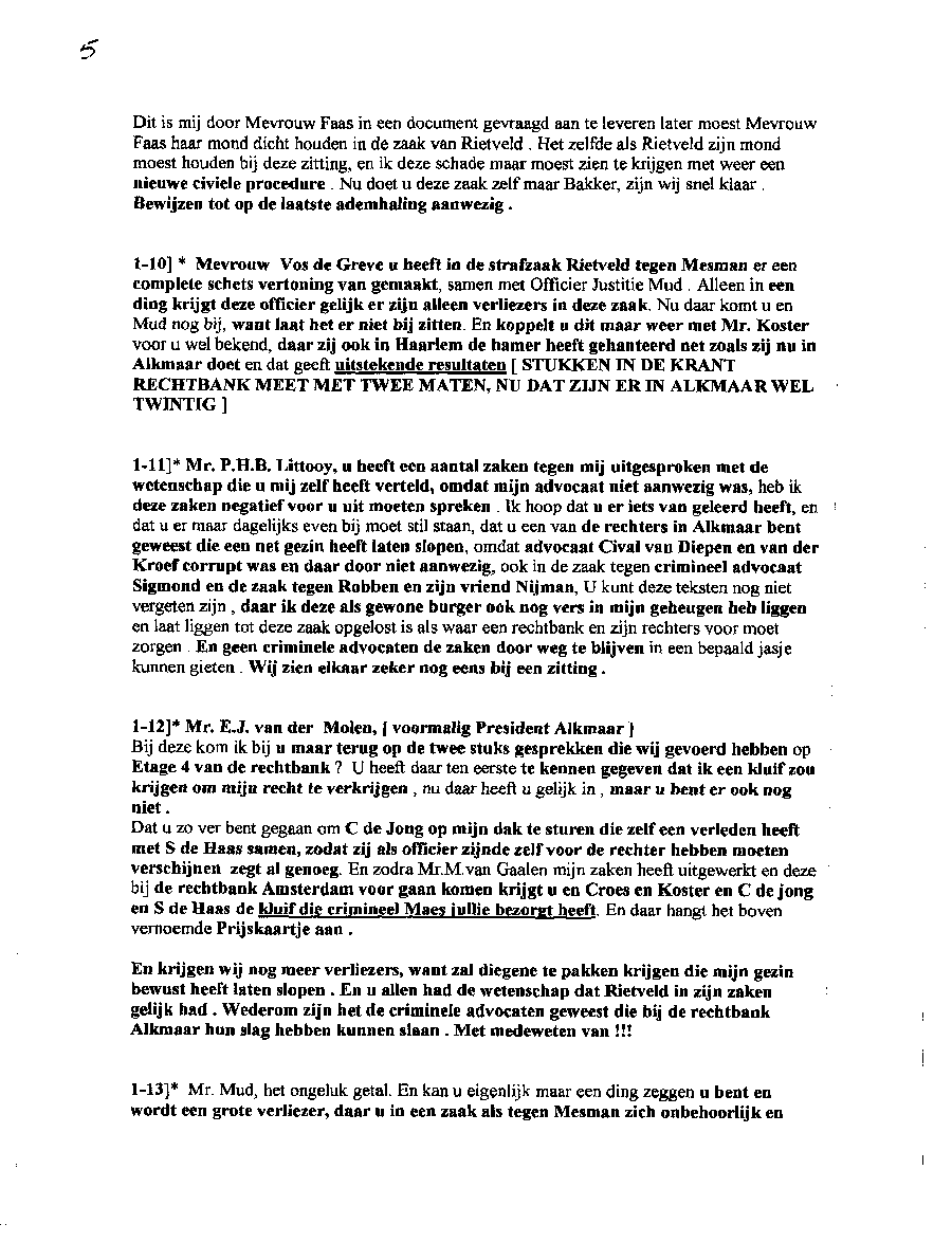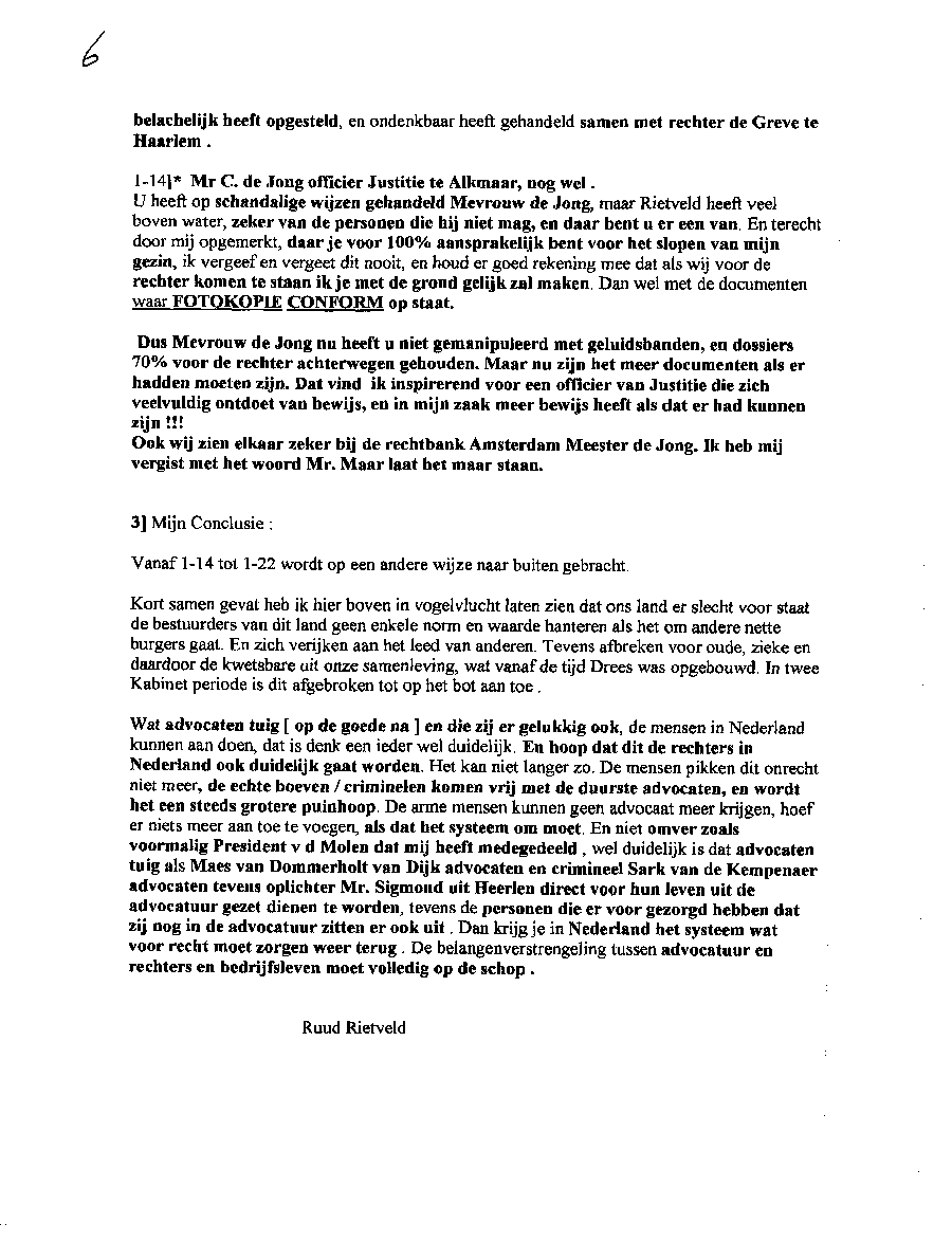 Vanaf 1-14 tot 1-22 wordt op een andere wijze naar buiten gebracht. Kort samengevat heb ik hier boven in vogelvlucht laten zien dat ons land er slecht voor staat. De bestuurders van dit land kennen geen enkele norm en waarde als het om andere nette burgers gaat, maar zich verijken aan het leed van anderen. Tevens afbreken zij af voor de ouden, zieken en daardoor de kwetsbaren uit onze samenleving, dat wat vanaf de tijd Drees was opgebouwd. In twee Kabinetsperiode is dit afgebroken tot op het bot aan toe. Wat dat advocatentuig [ op de goede na, en die zij er gelukkig ook ] de mensen in Nederland kunnen aandoen, dat is denk ik een ieder wel duidelijk. En ik hoop dat dit de rechters in Nederland ook duidelijk gaat worden. Het kan niet langer zo. De mensen pikken dit onrecht niet meer, de echte boeven / criminelen komen vrij met de duurste advocaten, en wordt het een steeds grotere puinhoop. De arme mensen kunnen geen advocaat meer krijgen. Ik hoef er niets meer aan toe te voegen, dan dat het systeem om moet. En niet omver, zoals voormalig President van der Molen dat mij heeft medegedeeld. Wel is duidelijk dat advocatentuig als Maes van Dommerholt van Dijk Advocaten en de crimineel Sark van de Kempenaer Advocaten maar ook de oplichter Mr. Sigmond uit Heerlen, direct voor het leven uit de advocatuur gezet dienen te worden. Daarnaast de personen die er voor gezorgd hebben dat zij nog in de advocatuur zitten, die ook er uit !! Dan krijg je in Nederland het systeem wat voor recht moet zorgen weer terug. De belangenverstrengeling tussen advocatuur en rechters en bedrijfsleven moet volledig op de schop. Ruud Rietveld