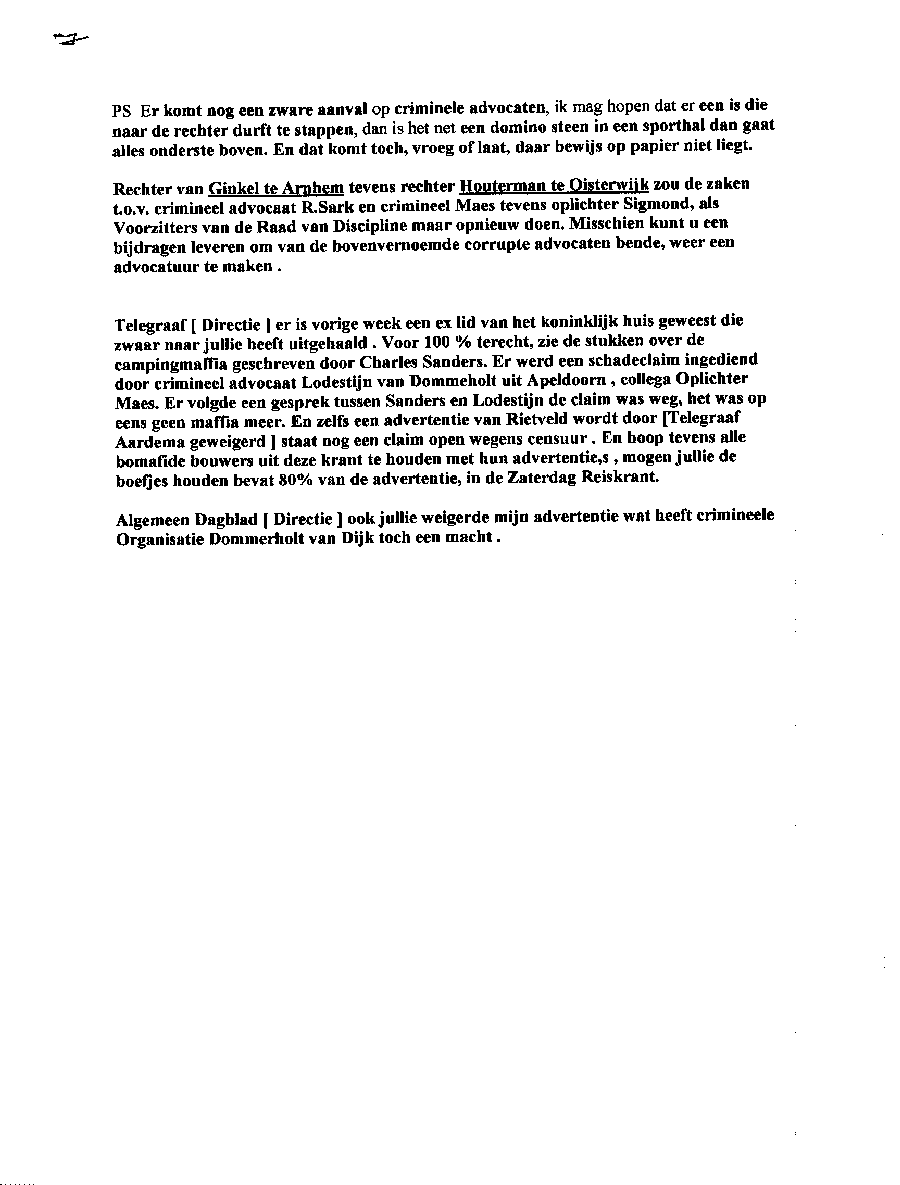 Rechter van Ginkel te Arnhem, tevens rechter Houterman te Oisterwijk, zou de zaken t.o.v. crimineel advocaat R. Sark en crimineel Maes, tevens oplichter Sigmond, als Voorzitters van de Raden van Discipline maar opnieuw doen. Misschien kunt u een bijdrage leveren om van de bovenvernoemde corrupte advocatenbende weer tot een advocatuur te maken. Telegraaf [ directie ], er is vorige week een ex-lid van het koninklijk huis geweest die zwaar naar jullie heeft uitgehaald. Voor 100 procent terecht, zie de stukken over de campingmaffia geschreven door Charles Sanders. Er werd een schadeclaim ingediend door de criminele advocaat Lodestijn van Dommeholt uit Apeldoorn, een collega van oplichter Maes. Er volgde een gesprek tussen Sanders en Lodestijn, en de claim was weg, er was opeens geen maffia meer. En zelfs een advertentie van Rietveld wordt door [Telegraaf, Aardema, geweigerd ]. Daarvoor staat nog een claim open wegens censuur. En ik hoop tevens alle bomafide bouwers uit deze krant te houden met hun advertenties, dan mogen jullie de boefjes houden voor 80% van de advertentiea in de zaterdagde Reiskrant. Algemeen Dagblad [ Directie ] ook jullie weigerde mijn advertentie wat heeft criminele Organisatie Dommerholt van Dijk toch een macht. |