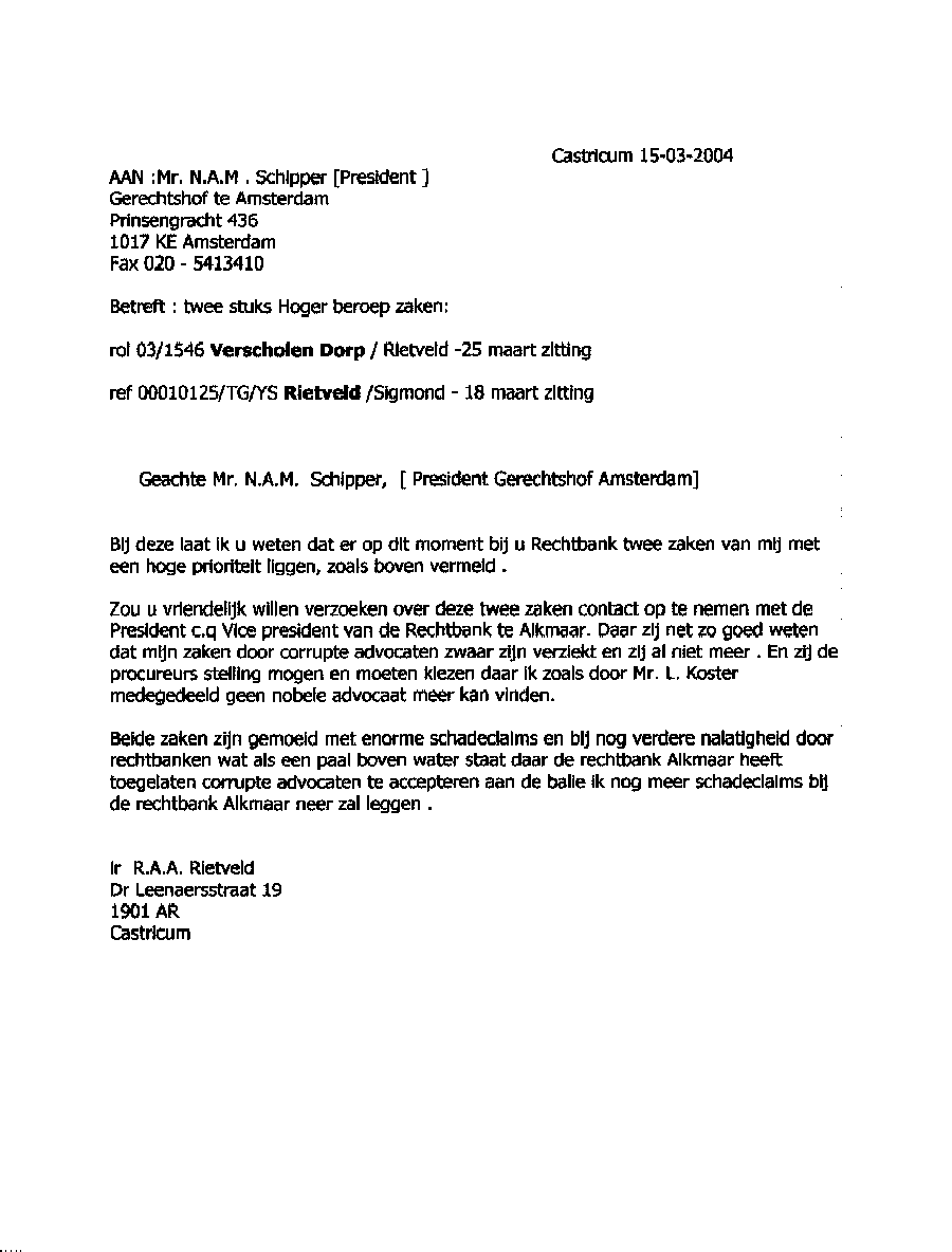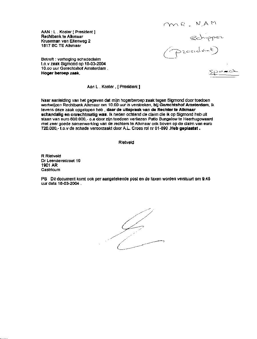 Faxbericht aan mr. Maes van Kees Griesdoorn over schijneisers