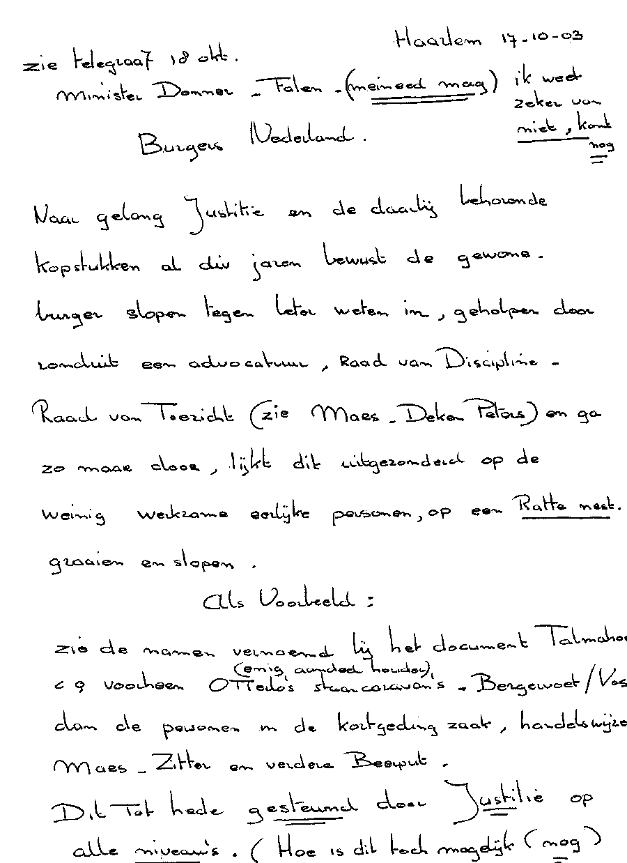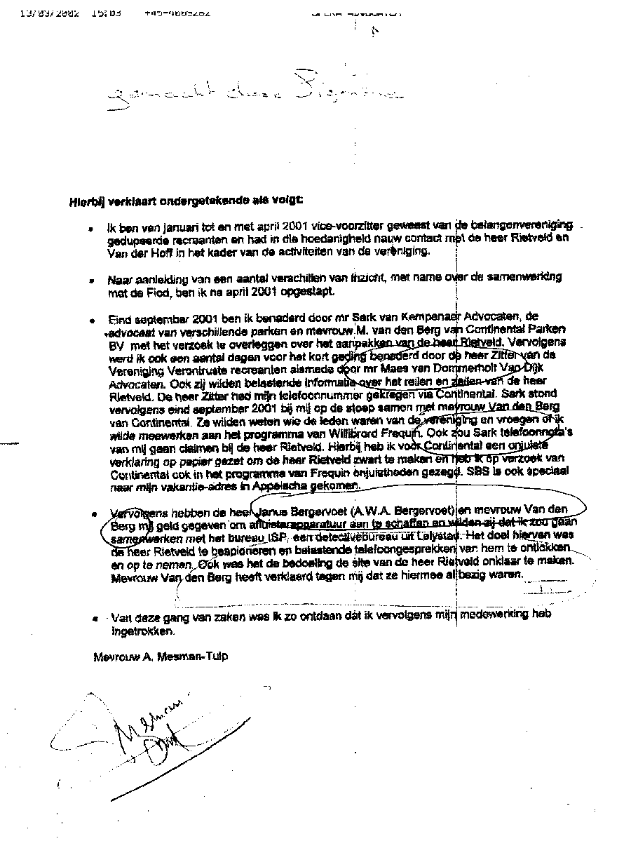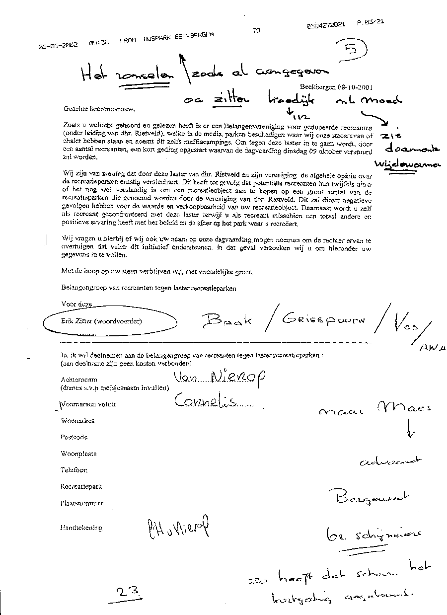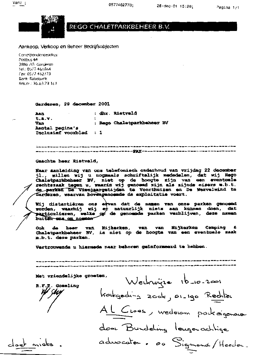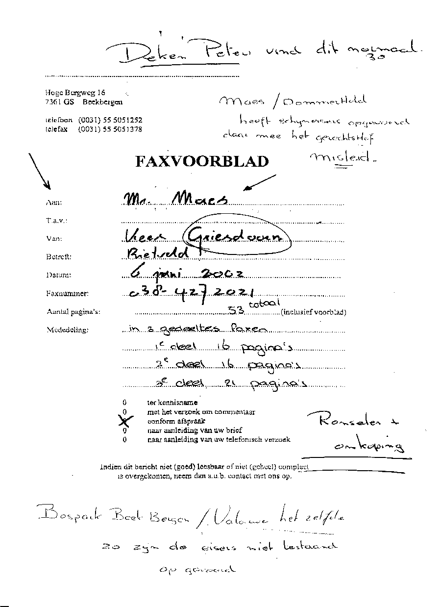 Faxbericht aan mr. Maes van Kees Griesdoorn over schijneisers